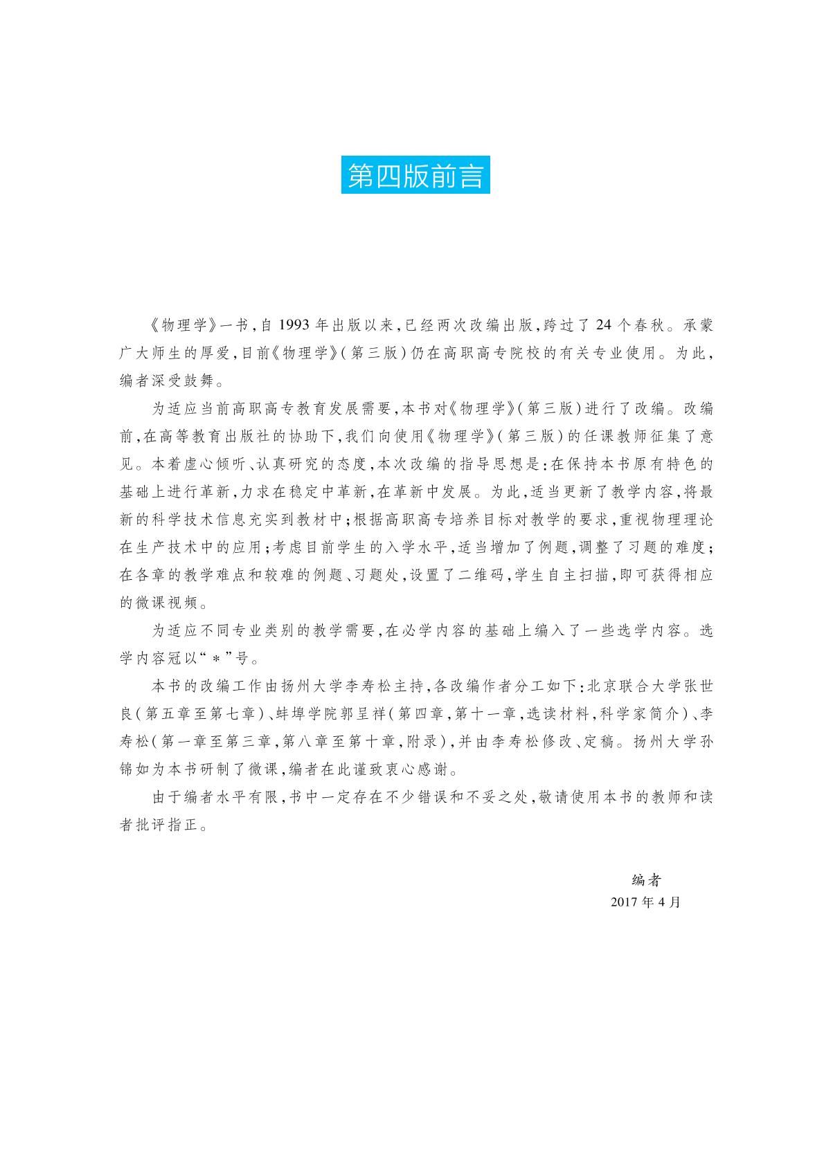 本书是在全国高职高专教育“十一五”规划教材《物理学》(第三版)的基础上修订而成的。本书在编写中不追求缜密的理论推导和论证,而着重阐明物理学的基本概念和基本规律;重视物理学理论在生产技术中的应用,既有联系工程实际的接口性内容,又有适当渗透近代物理思想观点的窗口性内容;在有关内容中采用了模型法、对比法、综合分析法和近似计算法等,有利于培养学生的科学思维能力;在每章后面都附有选读材料和科学家简介,以拓宽学生的视野。全书共11章,内容包括:运动和力、动量守恒能量守恒、刚体的定轴转动、热力学基础、静电场、恒定磁场、电磁感应、机械振动、机械波、波动光学和近代物理简介,书末备有附录和习题答案。此外,在各章教学难点和较难的例题及习题处设置了二维码,学生自主扫描即可获得相应的微课视频。 本书可作为高职高专院校、成人高校及本科院校开办的独立学院、继续考试学院和民办高校各有关专业的大学物理课程教材。 |