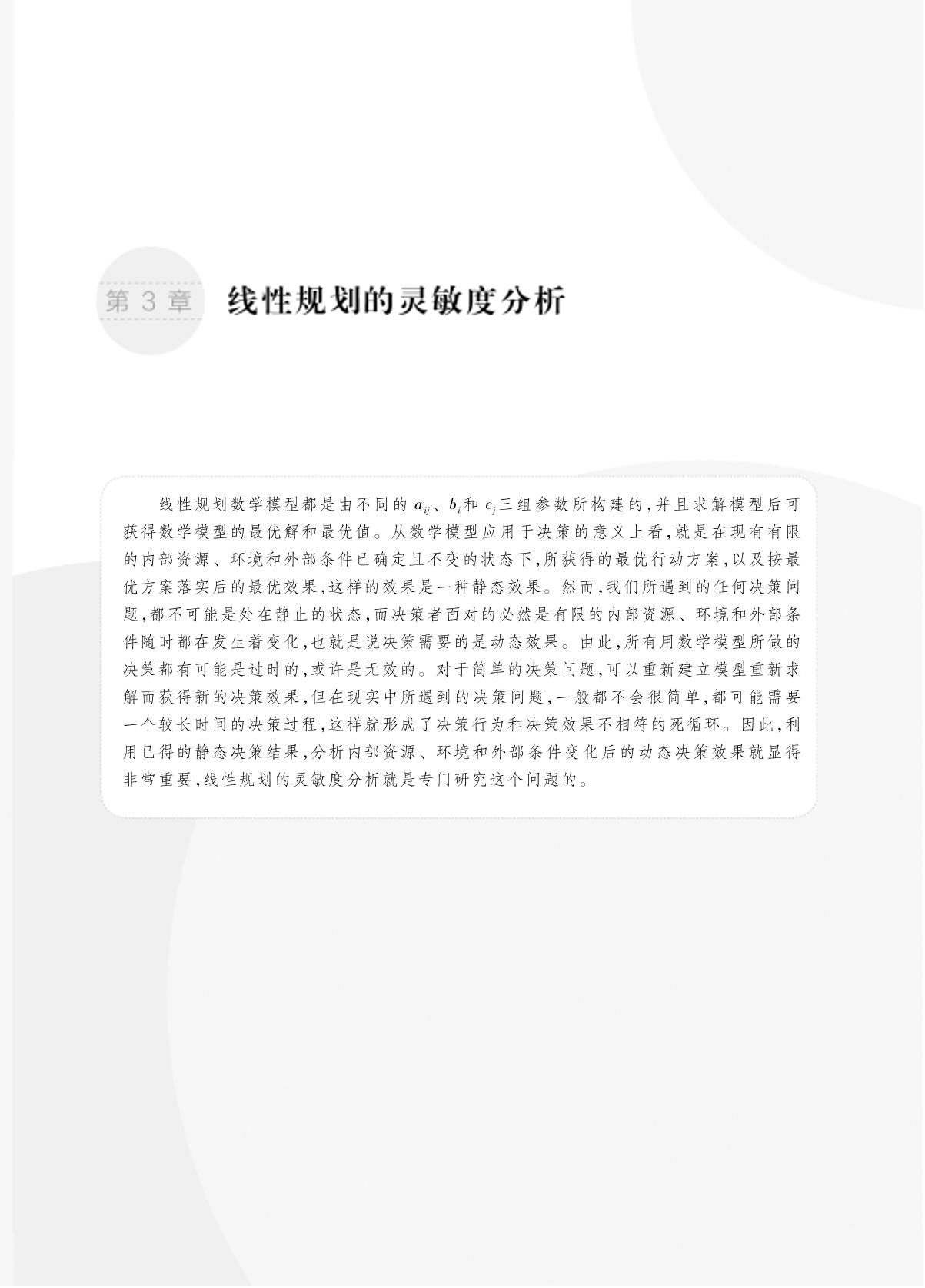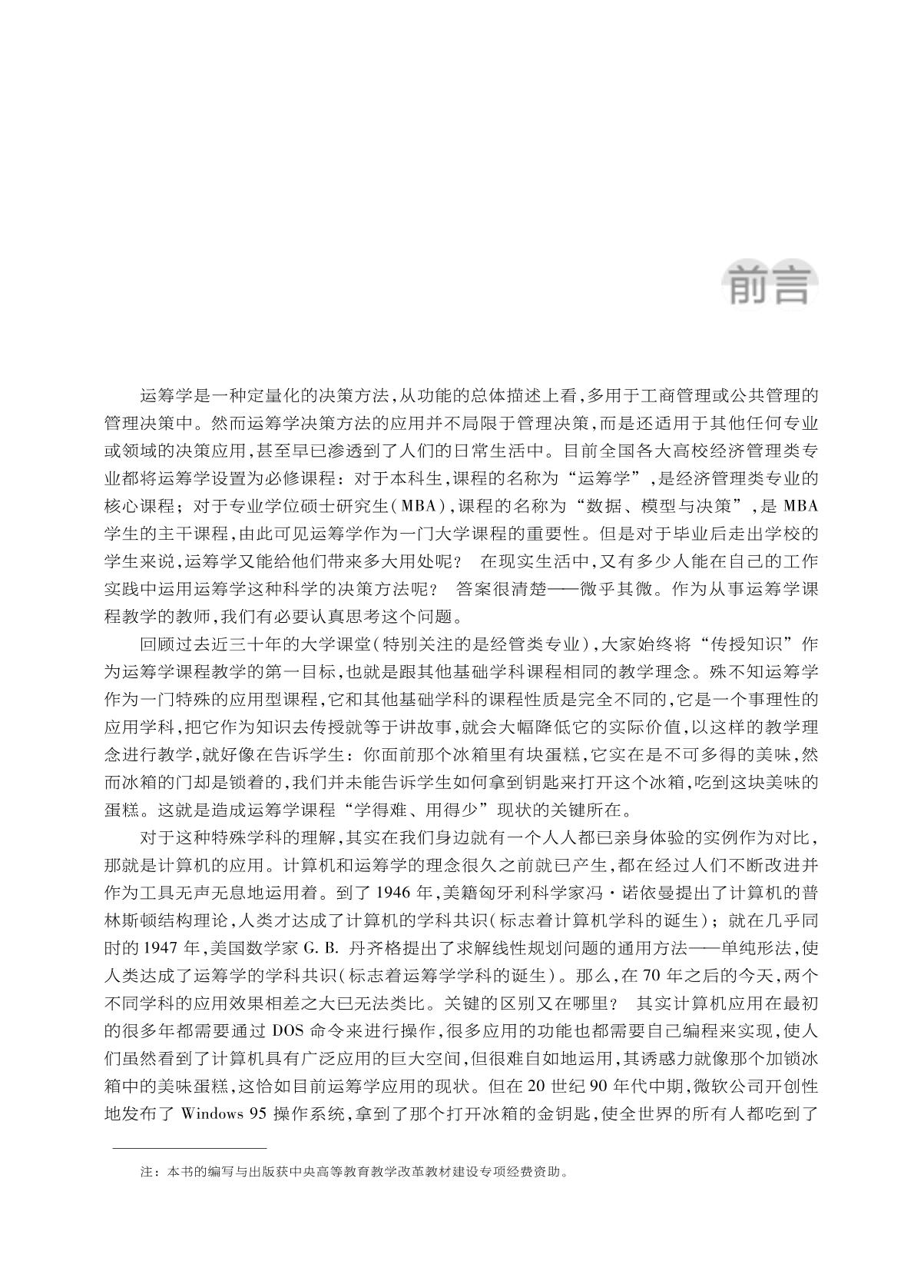 本书以实用案例为载体介绍当今运筹学模型在管理决策方面的应用方法。限于篇幅又为了使数学模型的应用研究能达到实际运用的层面,本书只研究三个主要的运筹学数学模型,如第2章的决策分析模型、第9章中的预测模型,其余的篇幅都是研究线性规划模型的应用。其中第2章和第3章研究了线性规划的基础数学模型,第4至第8章都是研究线性规划的拓展应用。这5章主要从两个方面研究线性规划应用于管理决策的简化方法:一方面是在线性规划数学模型的表述上进行简化,如第5章的整数规划模型、第6章的运输模型、第7章的目标规划模型;另一方面是强化求解方法,如第4章和第8章的应用方法研究,都是将复杂数学模型的建模和求解由计算机智能化地完成,从而简化了整个决策过程。第10章分别由简单到复杂研究了9个实用性的决策案例,通过这些案例的研究与分析,读者可从应用层面亲身体验运筹学在管理决策中的运用。 本书可用作高等教育各类专业本科生,特别是工商管理类专业本科生和MBA教材和参考书,也可供各类管理者阅读和参考。 |
