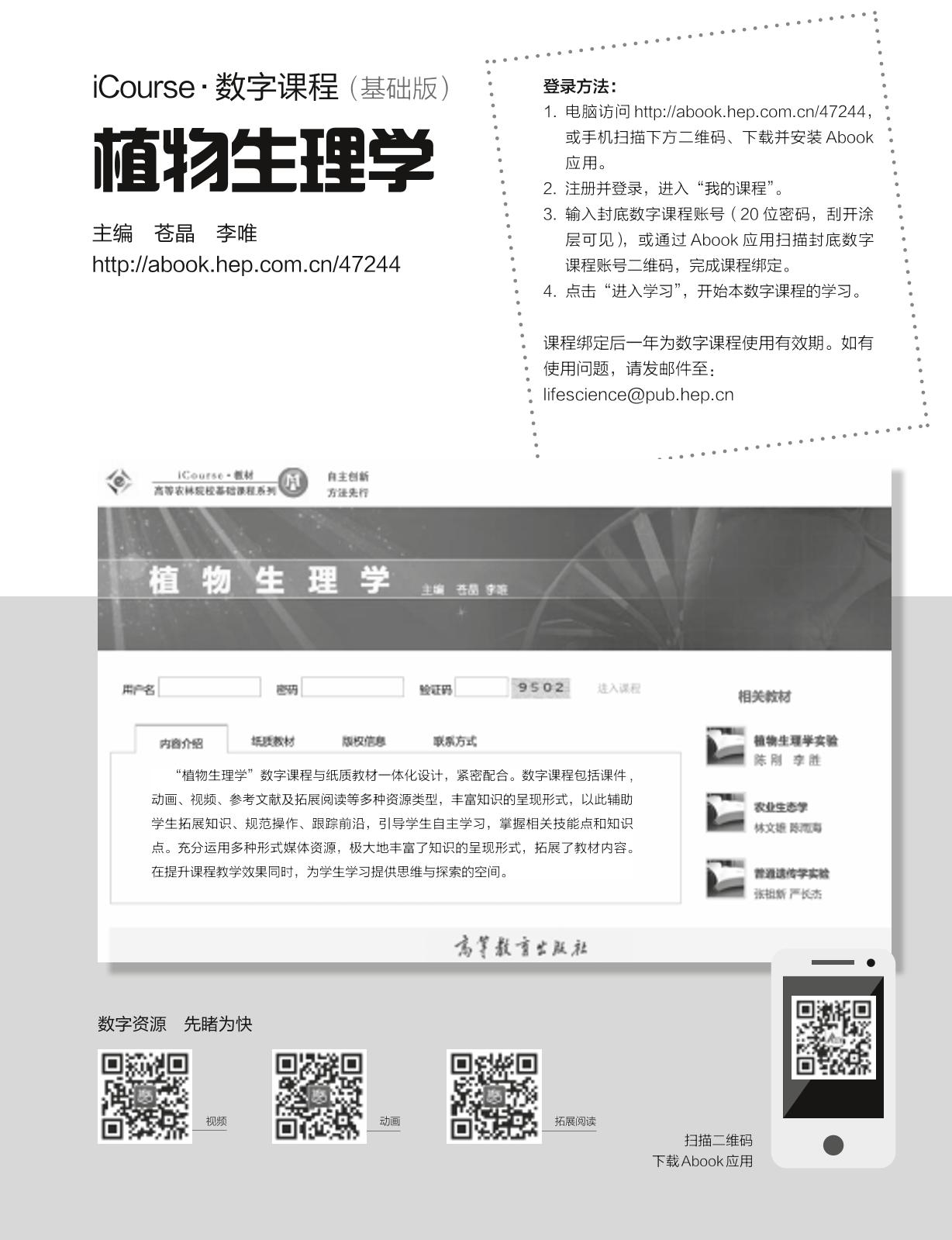 植物生理学是研究植物生命活动规律及其与环境关系的科学,是农学类?生物科学类各专业的重要专业基础课程? 本教材是“iCourse?教材:高等农林院校基础课程系列”之一,全书共12章,按照“细胞生理→代谢生理→信号转导→发育生理→逆境生理”的体系编排,主要内容包括:植物细胞的结构与功能;植物的水分生理?矿质营养?光合作用?呼吸作用?同化物运输与分配;植物的细胞信号转导?植物生长物质;植物的生长生理?生殖生理?成熟和衰老生理;植物的逆境生理?为方便学生复习和自学,本教材配套的数字课程提供大量相关内容的数字资源,是教材内容的有力补充和扩展? 本书可作为全国高等院校植物生产类?生物科学类相关专业的植物生理学教材,也可作为植物学科各领域的教学?科研人员及考研学生的参考用书? |
