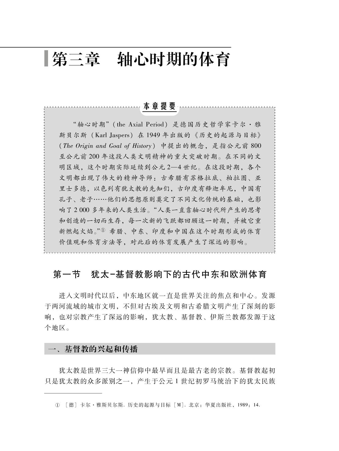 本书是2009年版《体育史》教材的修订本。全书结构完整、史料翔实、内容新颖、版式活泼, 对体育的起源、古代不同区域的体育、“ 轴心时代” 东西方体育特点及其历史影响、中国体育历史演变的特点、文艺复兴以前相对独立发展的体育文化如何走向体育全球化的过程、体育全球化过程中民族体育文化面临的处境与挑战、体育发展与社会进步之间的复杂联系等问题, 都做了深入浅出的独到分析。 本书可作为高等学校体育专业通用教材, 也可作为体育专业研究生的参考教材和体育教师、体育管理人员及广大体育爱好者的参考资料。 |