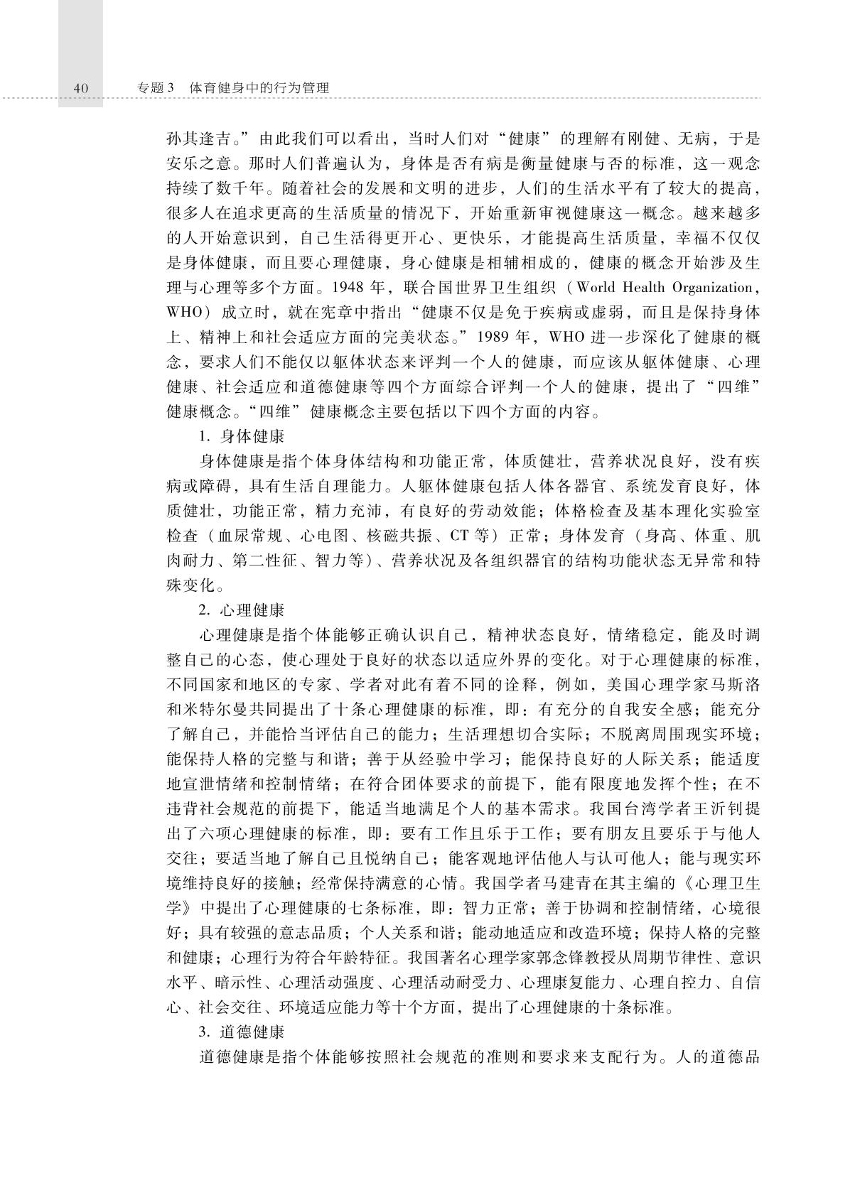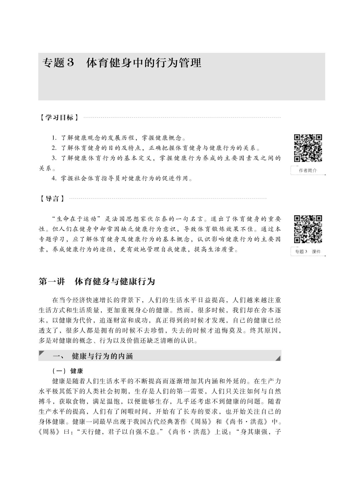 本书根据国家职业资格证书制度的相关要求和《社会体育指导员国家职业标准培训大纲》,由国家体育总局职业技能鉴定指导中心组织编写。主要内容包括社会体育指导员与体育健身休闲产业的发展、社会体育指导工作的政策法规、体育健身中的行为管理、体育健身场所的客户管理、户外休闲体育项目指导、体育健身方案制定与指导、体育健身活动的组织管理、身体素质的发展、体育健身中的营养问题、体重控制、体育健身指导服务中的公共关系技巧、体育健身效果测评、体育健身活动中的风险管理、社会体育指导工作的调查研究。 本书经国家体育总局社会体育指导员职业培训教材审定委员会审定,是用于社会体育指导员职业培训的唯一指定教材,也可作为高等学校社会体育专业学生以及社会体育工作从业者的参考用书。 |