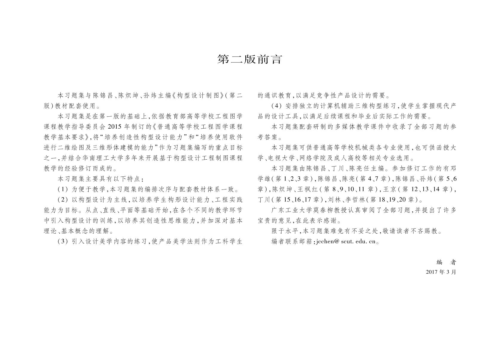 本习题集与陈锦昌、陈炽坤、孙炜主编《构型设计制图》(第二版)教材配套使用。本套教材以构型设计为主线,将构型设计的训练贯穿于工程制图课程的各个环节,在教学实践中通过手工二维绘图(视图及轴测图)、计算机三维建模软件的三维造型功能培养学生的构型设计能力。 本习题集主要内容包括:工程制图国家标准简介、工程制图的基本概念、工程制图的基本方法、点的投影、直线的投影、平面的投影、立体的投影、构型设计的美学基础、构型设计的基本方法、组合体构型及表达、组合体的尺寸标注、形体的视图表示、形体的剖视图表示、形体的断面图表示、标准件及常用件表示、零件表示、部件表示、计算机造型基础知识、三维特征造型方法、装配体等。 本习题集可作为普通高等学校机械类各专业工程制图课程的教材,也可供函授大学、电视大学、网络学院及成人高校等相关专业选用。 |