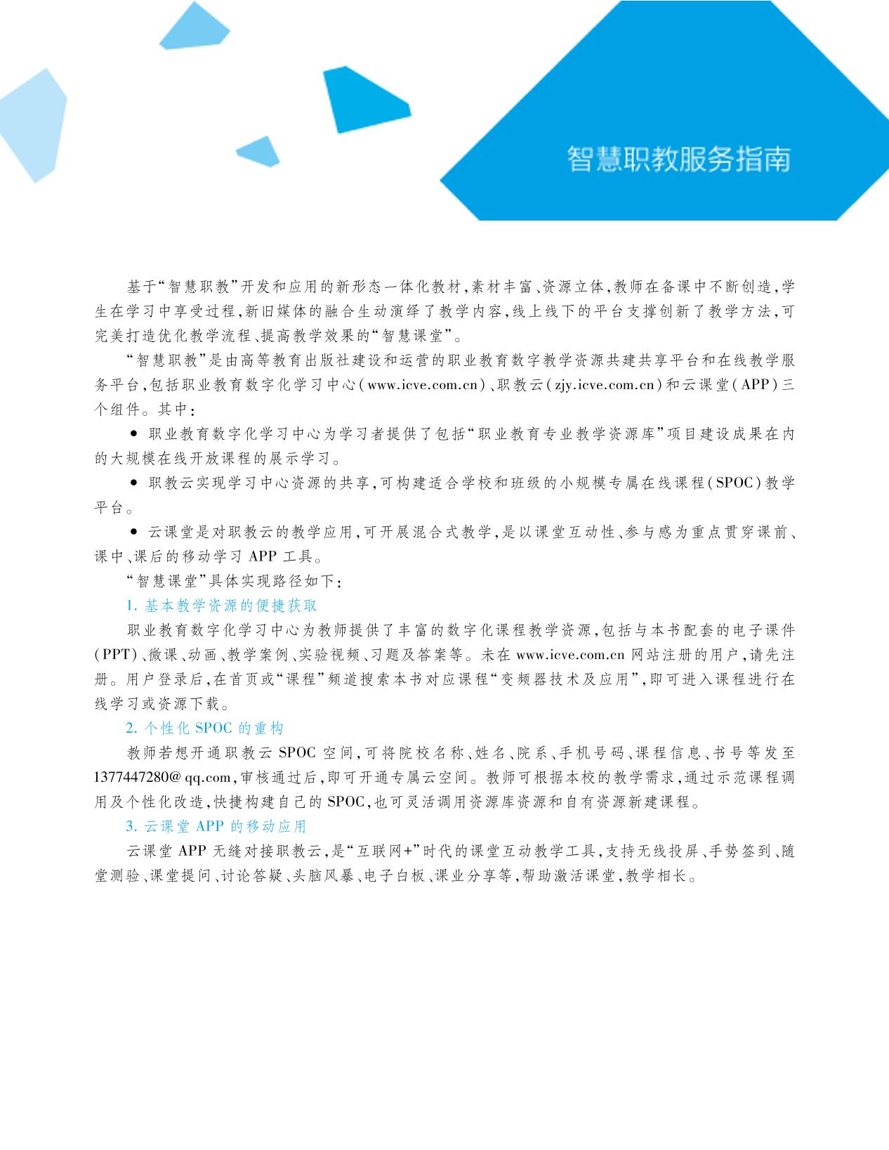 本书以“基于工作过程的课程开发理论”为指导思想,由校企合作共同编写。全书分为4个模块,下设11个教学项目及25个任务,内容包括认知变频器、变频器基本调速电路的装调、基于PLC的变频调速系统的装调和变频器的安装与维护。本书由编者与江苏石油化工股份有限公司、庄子电气有限公司等企业合作,共建教材资源。以企业案例为载体,精心设计教学内容与项目化课程知识体系,教学项目设计由易到难、层次递进,并围绕项目进行任务设计,实现基本操作与企业案例的融入和抽象理论与实践的紧密结合,解决原有的工作原理偏多,操作练习与实际应用脱节的问题。 本套教材的编写实现了互联网与传统教育的完美融合,采用“纸质教材+数字课程”的出版形式,以新颖的留白编排方式,突出资源的导航,扫描二维码,即可观看微课、动画等视频类数字资源,随扫随学,突破传统课堂教学的时空限制,激发学生的自主学习,打造高效课堂。同时借助“智慧职教”平台,配套微课、动画、视频、图片等数字化资源,并附带全套PPT课件、任务单、试题库、课程标准、教学整体设计、教学单元设计、习题作业等。资源的具体下载和获取方式请见“智慧职教服务指南”。 本书可作为高等职业院校电气自动化、机电一体化等相关专业的教材,也可作为工程技术人员的自学或参考用书。 |