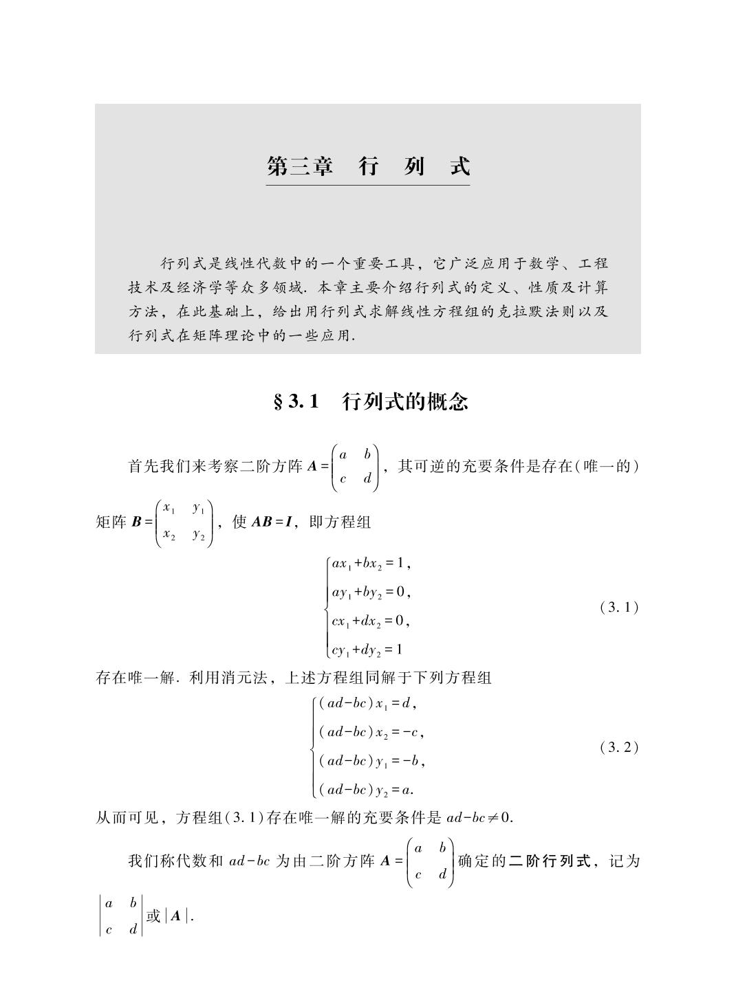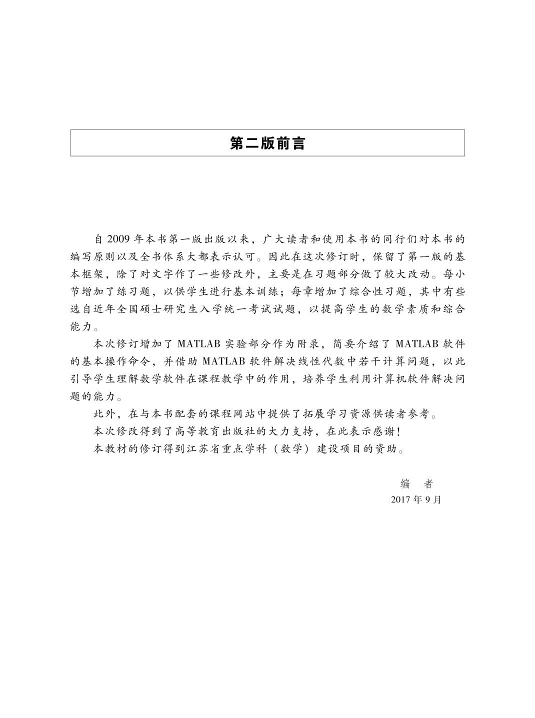 本书根据线性代数课程的教学基本要求编写而成。本着“以应用为目的、以必需和够用为尺度”的原则,全书在概念与理论、方法与技巧、实践与应用三方面,力求相互兼顾、合理安排,以培养学生的逻辑思维能力和数学应用能力,提高学生的综合素质。 本书内容包括:线性方程组与矩阵的概念、矩阵的运算与矩阵的秩、行列式、n维向量、矩阵的对角化、二次型及线性空间与线性变换等七章,每章均配有练习和综合习题,前六章均包含应用举例,书末附部分习题参考答案。前六章为本课程教学的基本要求内容,教学时数约为36学时,第七章可供教学要求较高的专业选用。书后附有MATLAB实验,旨在让学生了解如何运用软件进行线性代数问题的求解。在与本书配套的课程网站中提供了拓展学习资源供读者参考。 本书可供高等学校理工、经管等专业学生使用,也可作为自学者和工程技术人员的学习参考书。 |