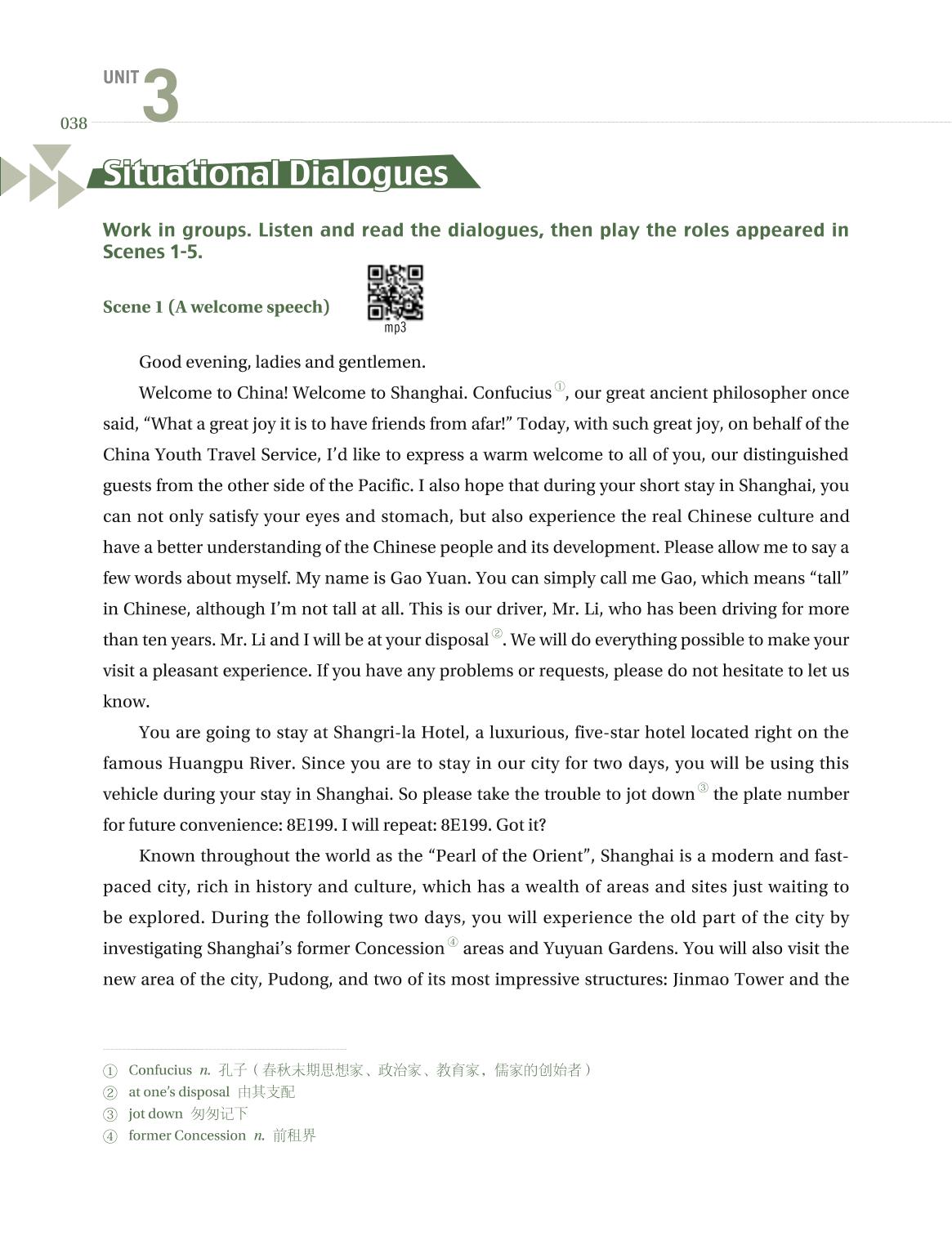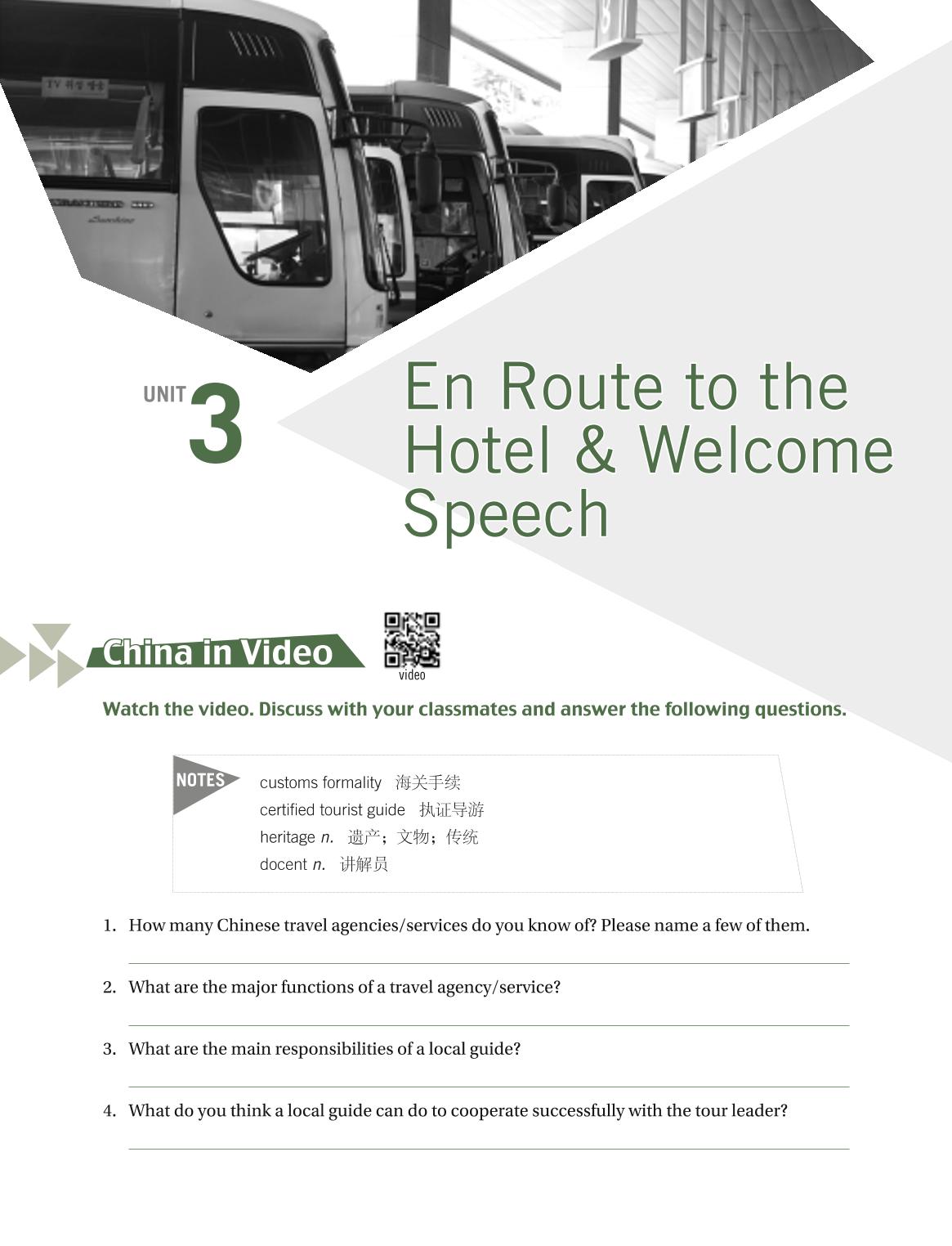 本教材编写团队从事英语教学多年,近年来将微课视频运用到旅游英语教学中,调动了学生的积极性,取得了较好的课堂效果。教材通过二维码形式,将音视频嵌入到纸质教材中,并添加中国旅游文化讲解,归纳了常用英文表达法,力求将英语语言能力、旅游专业知识及中国文化结合,提升学生的人文素养,提高对本国文化的自信心。 全书由十四个单元组成,包含十三个主题:旅游与导游、迎接宾客、欢迎致辞、宾馆入住、景点介绍、餐馆就餐等。每单元分为7个部分:1、视频中的中国 2、情景对话 3、实用句子 4、相关策略 5、文化差异 6、相关专业术语 7、练习。其中,较为有特色的是第一部分,书中会嵌入3分钟左右的原创视频,向学习者展示中国文化和美景的同时,提供地道的英文解说。 |