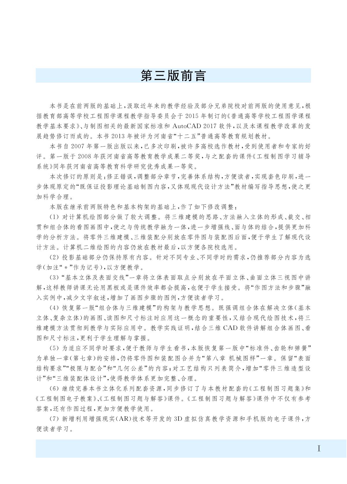 本书是在前两版的基础上,汲取了近年来的教学经验及部分兄弟院校对前两版的使用意见,根据教育部高等学校工程图学课程教学指导委员会于2015年制订的《普通高等学校工程图学课程教学基本要求》?与制图相关的最新国家标准和AutoCAD2017 软件,以及本课程教学改革的发展趋势修订而成的?本书被评为河南省第一批“十二五”普通高等教育规划教材(教高【2013】1075号)? 本书主要内容有制图的基本知识和技能?投影基础?基本立体及其表面交线?组合体?轴测图?工程形体的表达方法?标准件和常用件?机械图样?房屋建筑图简介?展开图?焊接图和标高投影及计算机绘图(二维绘图?三维建模)等? 本书提供了利用增强现实(AR)技术等开发的3D 虚拟仿真教学资源和手机版的电子课件,可方便读者学习?与本书配套的赵建国等主编《工程制图习题集》(第三版)以及配套的习题解答课件同时作了相应修订,对复杂的装配图还配有虚拟装配模型,可通过智能手机扫描或上网获取相关资料? 本书可作为高等工科院校近机类?非机类各专业制图课程(40~80 学时)的教材,也可作为成人教育?高职高专院校相关专业及网络远程教育制图课程的教材,还可供工程技术人员和自学者参考? |