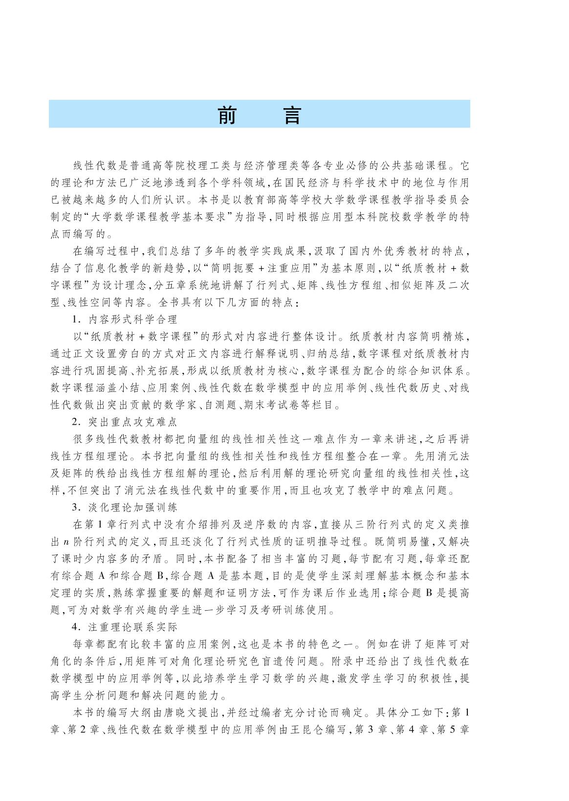 本书是以教育部高等学校大学数学课程教学指导委员会制定的“大学数学课程教学基本要求”为指导,结合应用型本科院校数学教学的特点编写的。全书以通俗易懂的语言,系统地讲解了行列式、矩阵、线性方程组、相似矩阵及二次型、线性空间等内容。全书结构严谨、理论系统、案例丰富、实用性强。每章还配有综合题A和综合题B,题型齐全,难易适中,并把数学建模的思想方法融入教材中。 本书纸质教材与数字课程一体化设计,配合紧密。数字课程涵盖小结、应用案例、线性代数在数学模型中的应用举例、线性代数历史、对线性代数做出突出贡献的数学家、自测题、期末考试卷等栏目,希望在提升应用型本科院校线性代数课程教学效果的同时,为学生的学习提供思维与探索的空间。 本书可作为应用型本科院校非数学专业的线性代数教材,也可作为相关专业学生考研的资料,还可供科技工作者和广大师生参考。 |
