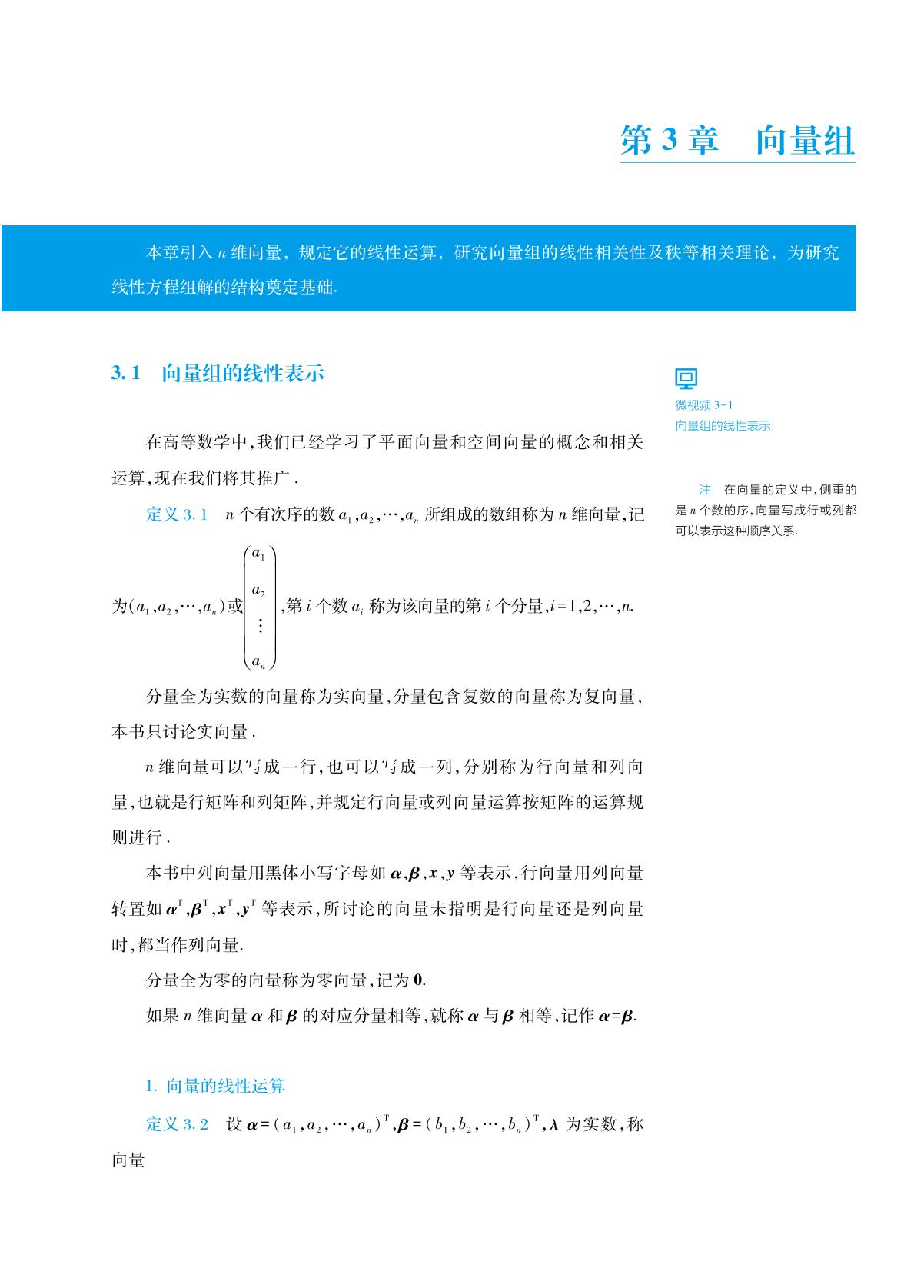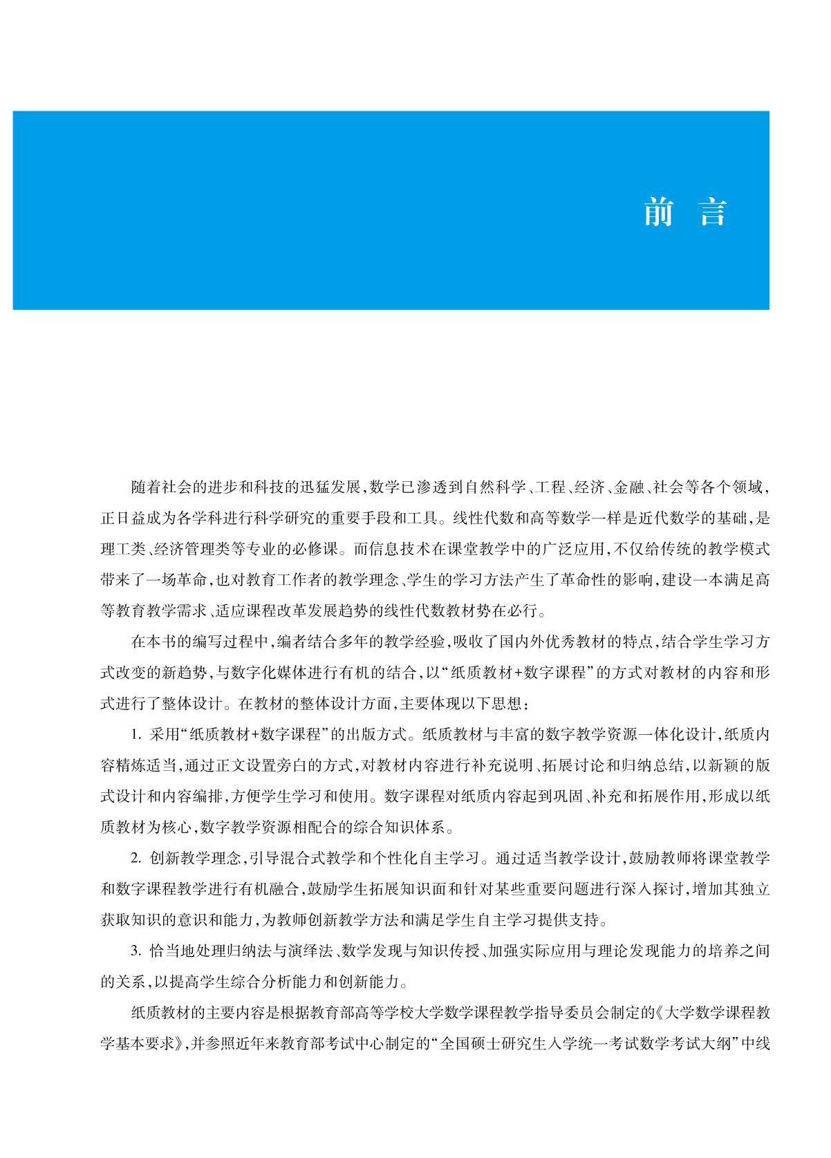 本书是根据教育部高等学校大学数学课程教学指导委员会制定的《大学数学课程教学基本要求》(2014年版)和教育部考试中心制定的“全国硕士研究生入学统一考试数学考试大纲”以及各学科专业对线性代数的基本要求,并结合作者多年的教学经验编写的。 本书分为行列式、矩阵及其运算、向量组、线性方程组、相似矩阵与二次型等五章。每章配有应用实例和用MATLAB进行计算的简单例子。本书结构严谨、条理清楚、语言通俗易懂、论述简明扼要、例题与习题难度适中且题型丰富。本书纸质内容与数字化资源一体化设计,紧密配合。数字课程涵盖微视频、电子教案、概念解析、典型例题解析、归纳总结、背景阅读、自测题等栏目,在提升课程教学效果的同时,为学生学习提供思维与探索的空间,便于学生自主学习。 本书可作为高等学校非数学类专业的线性代数教材,也可作为科技工作者学习线性代数知识的参考书。 |