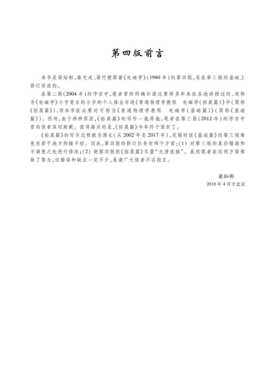 本书是“十二五”普通高等教育本科国家级规划教材,是在第三版的基础上修订而成的,第二版是教育部“高等教育面向21世纪教学内容和课程体系改革计划”的研究成果,是面向21世纪课程教材,第一版是梁灿彬、秦光戎、梁竹健原著教材《电磁学》(1980年)(该书曾获首届国家教委高等学校优秀教材一等奖)。这次修订时注意保持原版的基本风格,对部分欠妥之处进行了改正。
