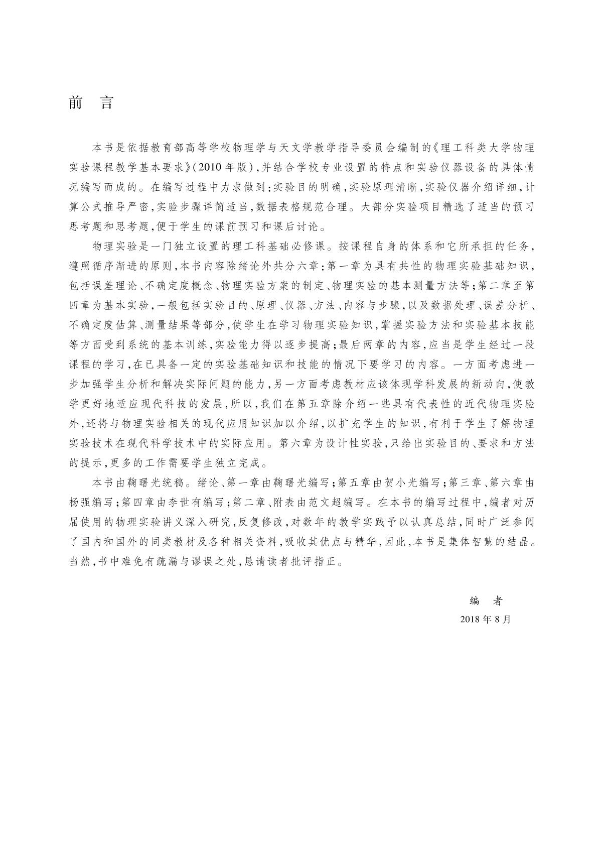 前辅文 绪论 物理实验的地位和作用 物理实验课的目的和任务 物理实验课的三要素 第一章 测量误差?不确定度及数据处理基础知识 第一节 测量误差的基本知识 第二节 不确定度的基本概念 第三节 间接测量的不确定度 第四节 有效数字及其运算规则 第五节 数据处理常用方法 第六节 物理实验基本测量方法 第七节 物理实验最佳方案选择 第二章 力学和热力学实验 实验2-1 长度的测量 实验2-2 质量与密度的测量 实验2-3 静态拉伸法测金属丝弹性模量 实验2-4 用光杠杆法测量固体的线胀系数 实验2-5 用干涉法测量固体的线胀系数 实验2-6 声波速度的测量 实验2-7 刚体转动惯量的测量 第三章 电磁学实验 实验3-1 电阻元件伏安特性的测定 实验3-2 电表的改装与校准 实验3-3 电桥的使用 实验3-4 电势差计测量电源电动势及电阻 实验3-5 铁磁材料居里温度的测定 实验3-6 示波器的使用 实验3-7 霍尔效应法测磁场 实验3-8 灵敏检流计特性研究 实验3-9 铁磁材料动态磁滞回线和磁化曲线的测量 实验3-10 载流导体磁场的测量 实验3-11 非平衡电桥及应用 第四章 光学实验 实验4-1 光路调整与透镜焦距的测量 实验4-2 分光计的调整与光栅衍射实验 实验4-3 牛顿环法测曲率半径 实验4-4 双棱镜法测光波波长 第五章 近代物理实验 实验5-1 迈克耳孙干涉仪的调整与使用 实验5-2 光学全息照相 实验5-3 光电效应和普朗克常量的测定 实验5-4 密立根油滴实验 实验5-5 弗兰克-赫兹实验 实验5-6 核磁共振测磁场 实验5-7 利用光拍法测光速 实验5-8 超声波探伤实验 实验5-9 霍尔位置传感器的定标和杨氏模量的测定 实验5-10 传感器实验 实验5-11 PN结温度-电压特性的测定及数字温度计的设计 实验5-12 液晶电光效应实验 实验5-13 太阳能电池的特性测量及应用 第六章 设计性实验 实验6-1 自组望远镜与显微镜 实验6-2 重力加速度的测定 实验6-3 转动惯量的测定 实验6-4 用双臂电桥测定金属杆的电阻率 实验6-5 用电势差计测定电阻丝的电阻率 实验6-6 电磁波综合实验 实验6-7 磁光调制(法拉第效应)实验 实验6-8 A类超声诊断与超声特性 实验6-9 超声GPS三维声呐定位 附表 附表1 常用物理常量表 附表2 标准大气压下不同温度时水的密度 附表3 20 ℃时部分固体和液体的密度 附表4 海平面上不同纬度处的重力加速度 附表5 20 ℃时部分金属(或合金)的弹性模量 附表6 部分液体的黏度 附表7 不同温度下水的黏度 附表8 部分金属(或合金)的电阻率及其温度系数 附表9 部分物质的导热系数 附表10 某些物质中的声速 附表11 常用光谱灯或激光器的可见谱线波长