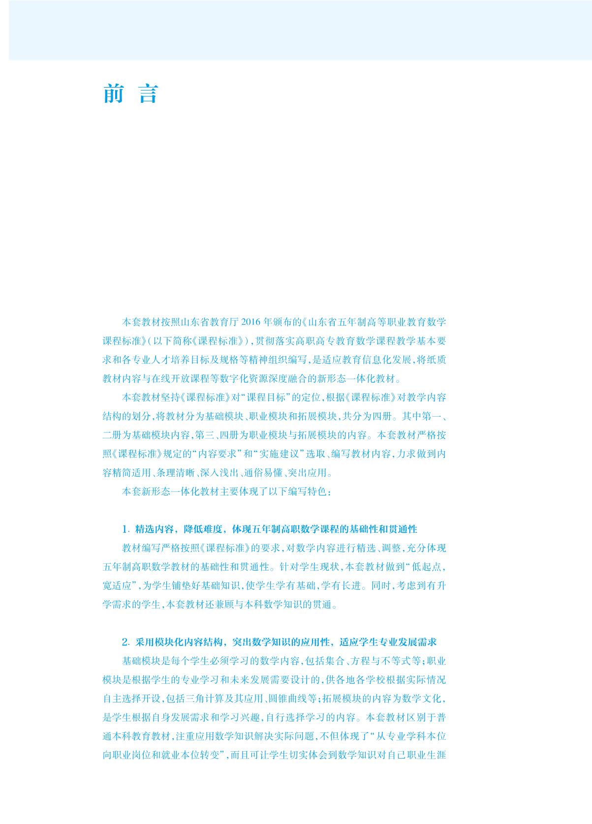 本套教材是按照山东省教育厅2016年颁布的《山东省五年制高等职业教育数学课程标准》(以下简称《课程标准》)编写的,是纸质教材内容与在线开放课程以及二维码资源等数字化资源深度融合的新形态一体化教材。 本套教材遵循《课程标准》对课程模块的划分,共分为四册,其中第一、二册为基础模块内容,第三、四册为职业模块与拓展模块内容。本书是《数学(基础模块)》(第二册),内容包括三角函数、平面向量、直线与圆的方程和概率与统计初步。本教材努力体现《课程标准》的精神和要求,内容精炼,“低起点,宽适应”,既与初中数学知识衔接,又兼顾与本科数学知识贯通,内容结构模块化,符合不同专业学生职业生涯发展需求,数学知识的应用性突出;重视培养学生数学工具的使用技能和数据处理技能,重视现代教育技术的应用,学习方式新颖,极大地延伸了学生的学习空间,充分体现了以服务发展为宗旨,以促进就业为导向的职业教育教学理念。 本书同步配套数学练习册、教学参考书以及在线开放课程等丰富的数字化资源。其中,在线开放课程包括教学短视频、电子教案、演示文稿以及测试题、讨论题等,并已在“爱课程”网“中国职教MOOC”平台上线。在线开放课程提供一系列教学活动,可供教师实施翻转课堂教学、混合式教学等,提高学生的学习兴趣。另外,教材加入了二维码资源,用手机扫描即可随时观看学习。 按照本书最后一页“郑重声明”下方的学习卡账号使用说明,登录http://abook.hep.com.cn/sve,可以上网学习,下载数字化资源。 教材可供五年制高等职业学校和三二连读学校的教师和学生使用。 |