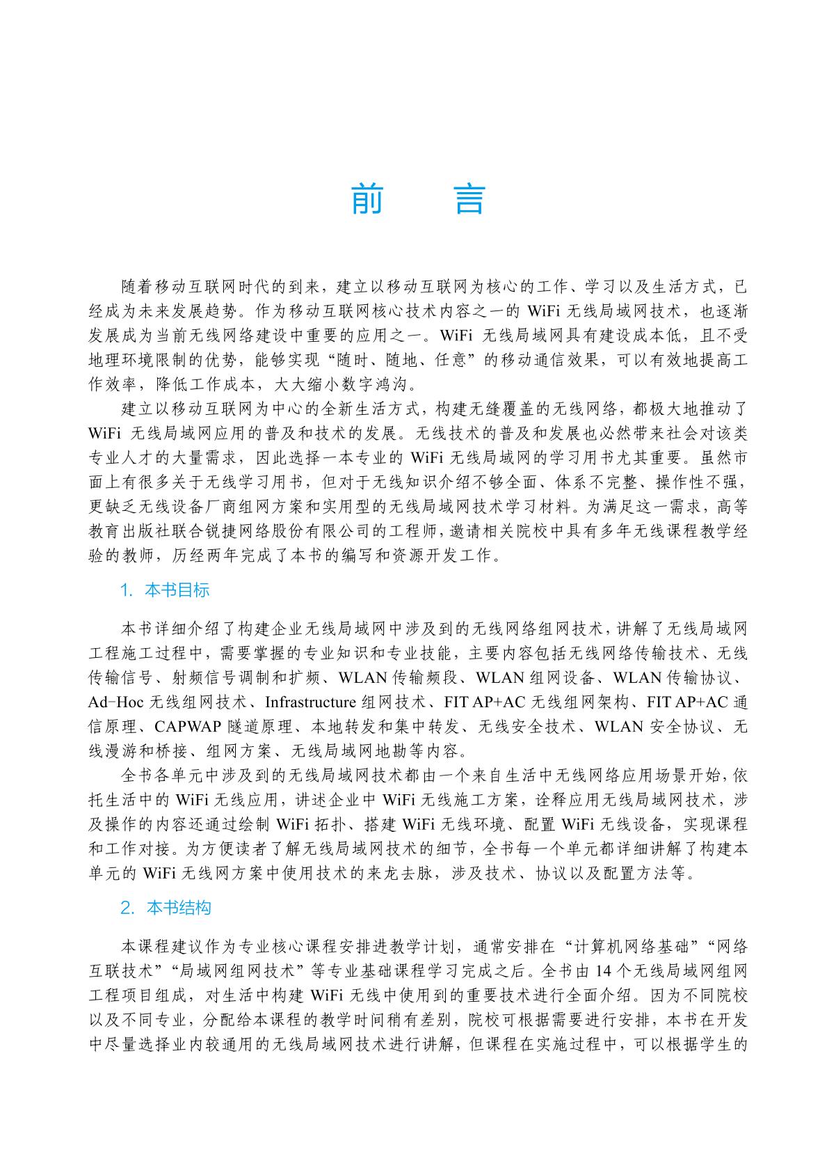 本书结合企业无线局域网工程项目,全面地讲解无线局域网工程施工过程中需要掌握的专业知识和专业技能,主要内容包括:无线基础知识、无线网络传输技术、无线传输信号、无线射频信号调制和扩频、WLAN传输频段、WLAN 组网设备、WLAN 传输协议、Ad-Hoc 组网技术、Infrastructure 组网技术、FIT AP+AC 无线组网架构、FIT AP+AC 通信原理、CAPWAP 隧道原理、本地转发和集中转发、无线安全技术、WLAN 安全协议以及无线漫游和桥接、组网方案、无线局域网地勘等内容。全书通过讲技术、读方案、做项目方式,诠释了无线局域网组网技术,突出WLAN项目施工。 本书可作为高等院校网络专业的教材,也可作为网络技术人员的参考书。 |