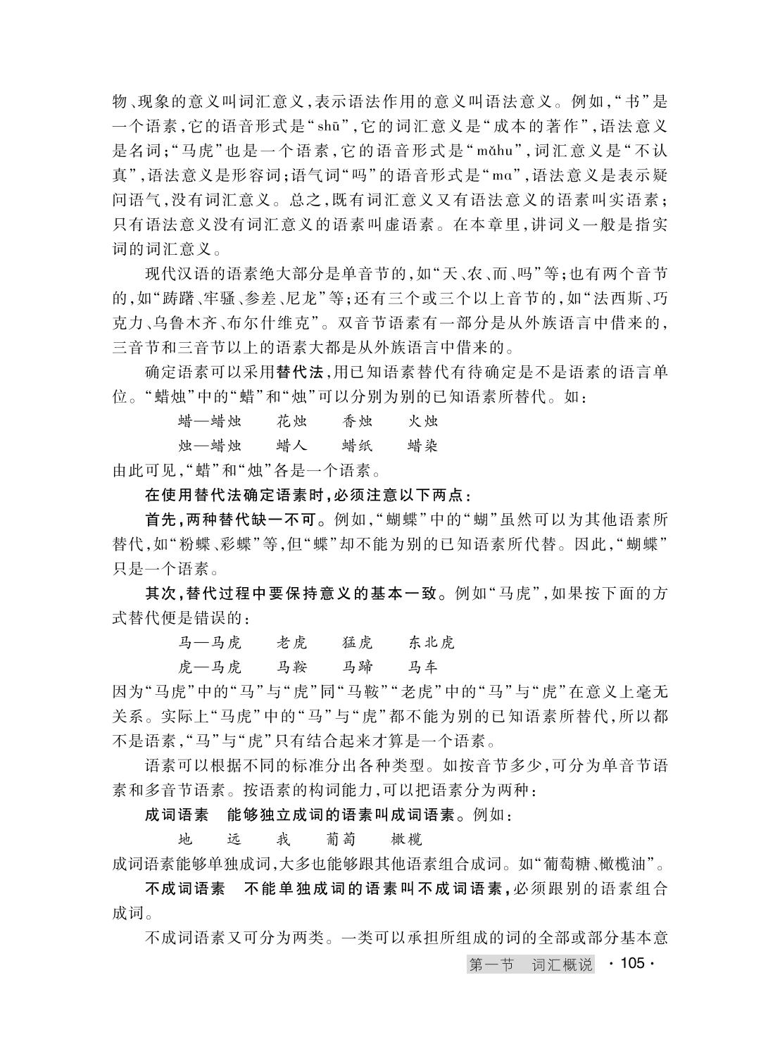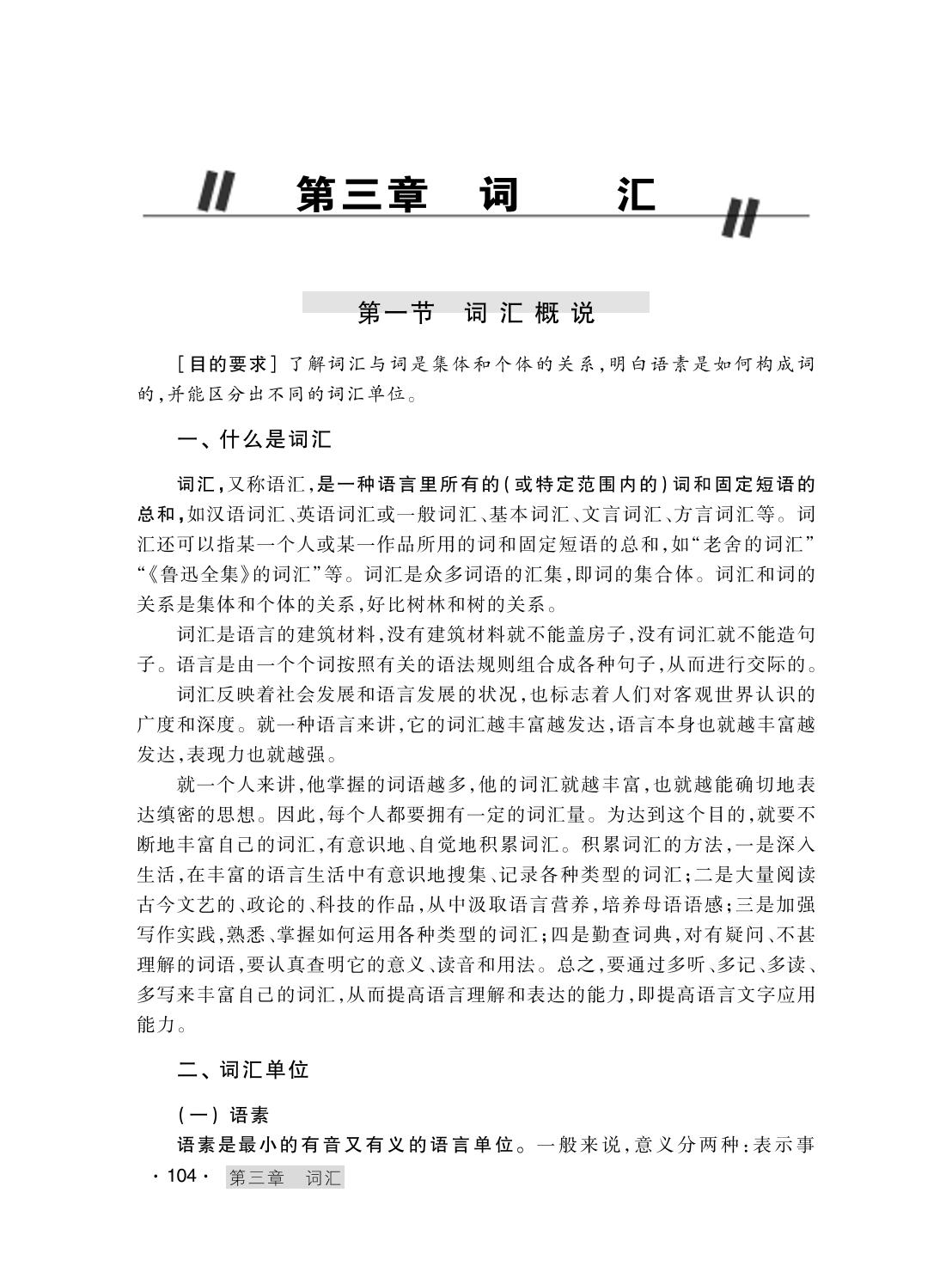 绪论 第一节 现代汉语概说 一、什么是现代汉语 二、现代汉民族共同语和现代汉语方言 三、现代汉语的特点 四、现代汉语的地位 思考和练习一 第二节 汉语规范化和推广普通话 一、国家的语言文字政策 二、现代汉语规范化 三、推广普通话 思考和练习二 第三节 现代汉语课的性质、任务和内容 思考和练习三 第一章 语音 第一节 语音概说 一、语音的性质 二、语音单位 三、记音方法和记音符号 思考和练习一 第二节 声母 一、什么是声母 二、声母的发音 三、声母辨正 思考和练习二 第三节 韵母 一、什么是韵母 二、韵母的发音 三、韵母的结构 四、韵母辨正 思考和练习三 第四节 声调 一、什么是声调 二、调型、调值和调类 三、普通话的声调 四、古今调类比较 思考和练习四 第五节 音节 一、什么是音节 二、音节的结构 三、普通话的声韵拼合规律 四、音节的拼写规则 思考和练习五 第六节 音变 一、变调 二、轻声 三、儿化 四、语气词“啊”的音变 思考和练习六 第七节 朗读和语调 一、朗读 二、语调 思考和练习七 第八节 语音规范化 一、确立正音标准 二、推广标准音 思考和练习八 第二章 文字 第一节 汉字概说 一、文字的性质 二、汉字的起源 三、汉字的特点 四、汉字的作用 思考和练习一 第二节 汉字的形体 一、汉字形体的演变 二、现行汉字的形体 思考和练习二 第三节 汉字的结构 一、结构单位 二、笔顺 三、造字法 思考和练习三 第四节 汉字的整理和标准化 一、汉字改革问题 二、汉字的整理 三、汉字的标准化 四、汉字的信息处理 思考和练习四 第五节 使用规范汉字 一、掌握规范字 二、纠正错别字 思考和练习五 第三章 词汇 第一节 词汇概说 一、什么是词汇 二、词汇单位 思考和练习一 第二节 词的结构 一、单纯词 二、合成词 思考和练习二 第三节 词的意义 一、什么是词义 二、词义的性质 三、词义的构成 思考和练习三 第四节 词义的分解 一、义项 二、义素 思考和练习四 第五节 词义的聚合 一、语义场 二、同义义场和同义词 三、反义义场和反义词 思考和练习五 第六节 词义和语境的关系 一、什么是语境 二、语境对词义的影响 思考和练习六 第七节 现代汉语词汇的组成 一、基本词汇和一般词汇 二、古语词、方言词、外来词 三、行业语、隐语、网络词语 思考和练习七 第八节 熟语 一、成语 二、惯用语 三、谚语 四、歇后语 思考和练习八 第九节 词汇的发展变化和词汇的规范化 一、词汇的发展变化 二、词汇的规范化 思考和练习九 第四章 语法 第一节 语法概说 一、语法和语法体系 二、语法的性质 三、语法单位和句法成分 思考和练习一 第二节 词类(上) 一、词类及其划分依据 二、实词 思考和练习二 第三节 词类(下) 一、虚词 二、词的兼类和借用 三、词类的误用 思考和练习三 第四节 短语 一、短语及其分类 二、短语的结构类型 三、短语的功能类型 四、多义短语 五、短语的分析 思考和练习四 第五节 句法成分 一、主语和谓语 二、动语和宾语 三、定语、状语、补语和中心语 四、独立语 思考和练习五 第六节 单句 一、句型 二、句式 三、句类 四、单句的类型系统 五、单句运用中的常见错误 思考和练习六 第七节 复句 一、复句概要 二、复句的意义类型 三、复句的结构类型 四、紧缩句 五、复句运用中的常见错误 思考和练习七 第五章 修辞 第一节 修辞概说 一、什么是修辞 二、修辞的原则 三、修辞的要求 四、修辞的手段 思考和练习一 第二节 词语的锤炼 一、意义的锤炼 二、声音的锤炼 思考和练习二 第三节 句式的选用 一、常式句和变式句 二、长句和短句 三、整句和散句 四、主动句和被动句 五、肯定句和否定句 思考和练习三 第四节 辞格 一、比喻 二、借代 三、比拟 四、夸张 五、双关 六、反语 七、排比、层递和反复 八、对比、映衬、对偶 九、拈连、仿词 十、顶真和回环 十一、设问、反问 十二、辞格的运用 思考和练习四 第五节 语体 一、口头语体 二、书面语体 思考和练习五 后记