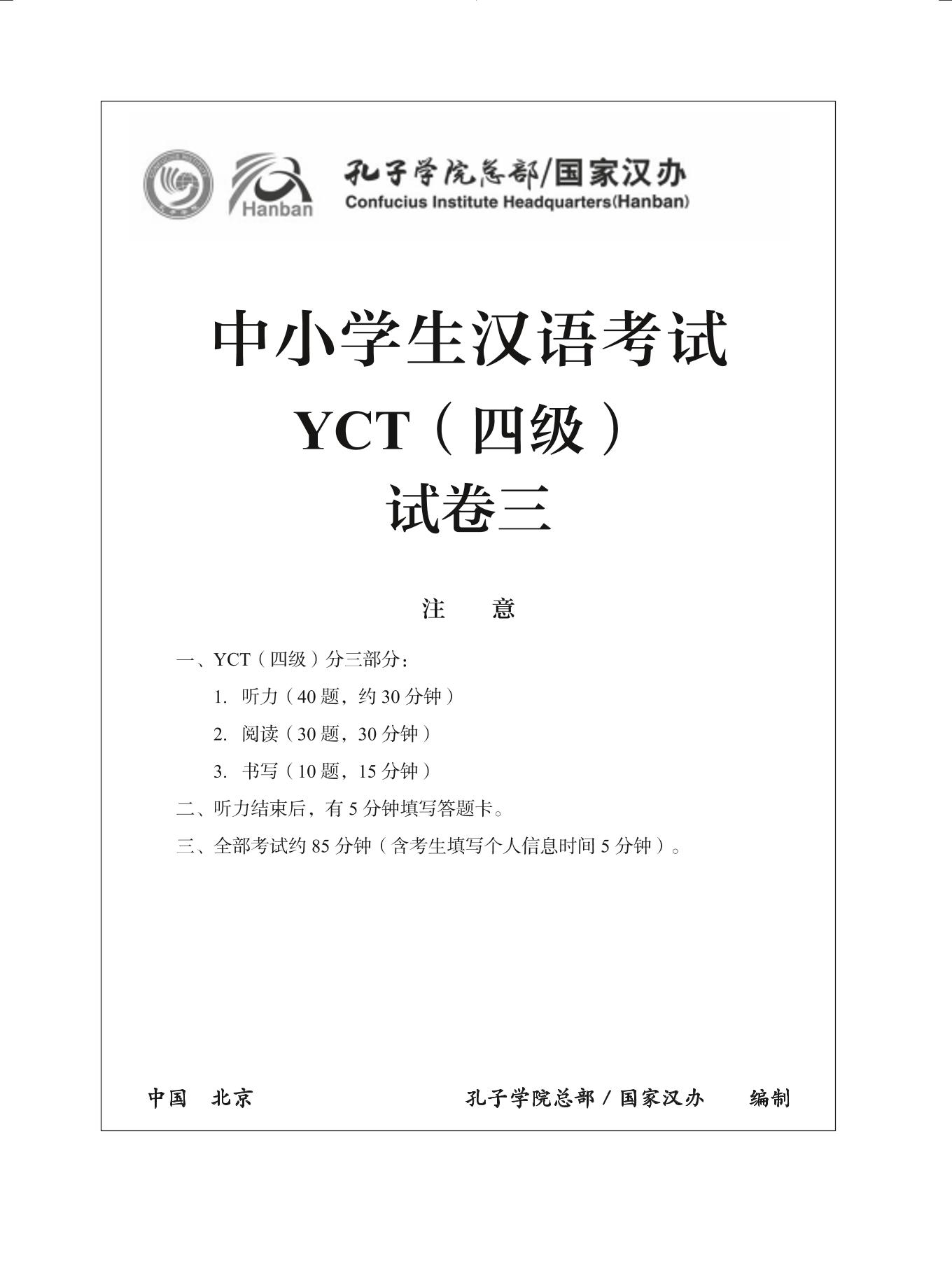 中小学生汉语考试(Youth Chinese Test,简称YCT)是孔子学院总部/国家汉办主办的一项国际语言能力标准化考试,重点考察汉语非第一语言的中小学生在日常生活和学习中运用汉语的能力。为了进一步满足广大汉语学习者学习、备考的需求,夯实“考教结合”“以考促教”“以考促学”的理念,我们从近两年的真题中精心挑选出高质量试卷集结成册出版。 《YCT真题集(2018版)》共4册,分别对应YCT考试一—四级,每册包含5套真题试卷,并配有听力录音文本和试卷答案。本书为《YCT真题集》四级,主要针对YCT四级考试的考生。 《YCT真题集》的推出,旨在为全球中小学生汉语学习者提供备考的有益指导,为日常学习提供阶段性的自评工具,同时也希望为国际汉语教师的教学提供有效参考。