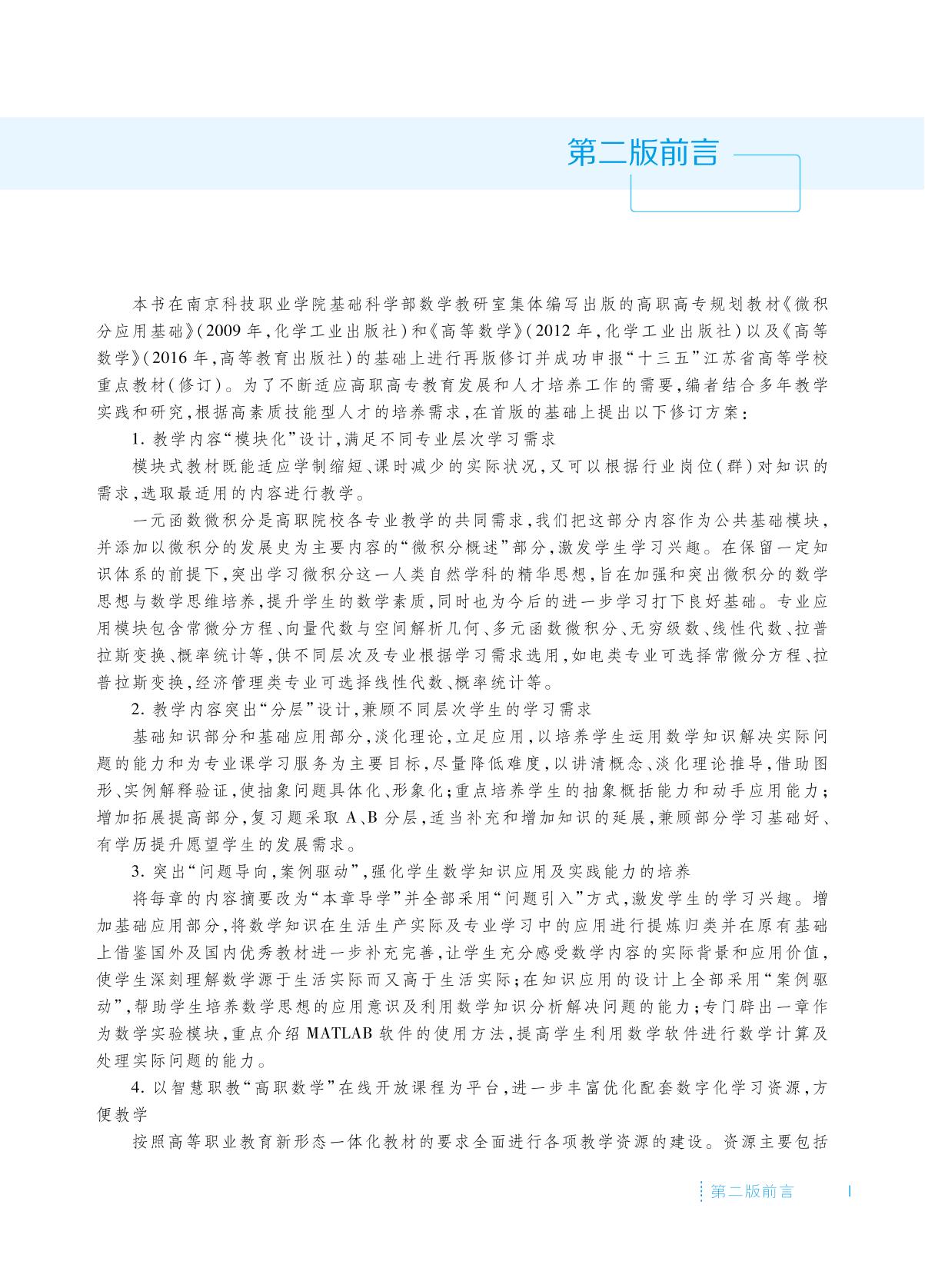 本书参照教育部原数学课程指导委员会制定的数学教学大纲内容,按照“基础理论教学以应用为目的,以必需够用为度”的原则及高职院校的培养目标编写,具备基础性、应用性与现代性的特点,体现高职特色。 本书在内容的组织上突出模块化思想。公共基础模块包括一元函数微积分的内容,专业应用模块包括常微分方程、向量代数与空间解析几何、多元函数微积分、无穷级数、线性代数、拉普拉斯变换、概率统计等,供不同专业选用。数学实验模块介绍了MATLAB软件的使用方法。书中的重要知识点配有讲解视频,读者可通过扫描书中二维码及时获取。 本书适用于高等职业院校各个专业,也可供应用型本科院校各专业选用。 |
