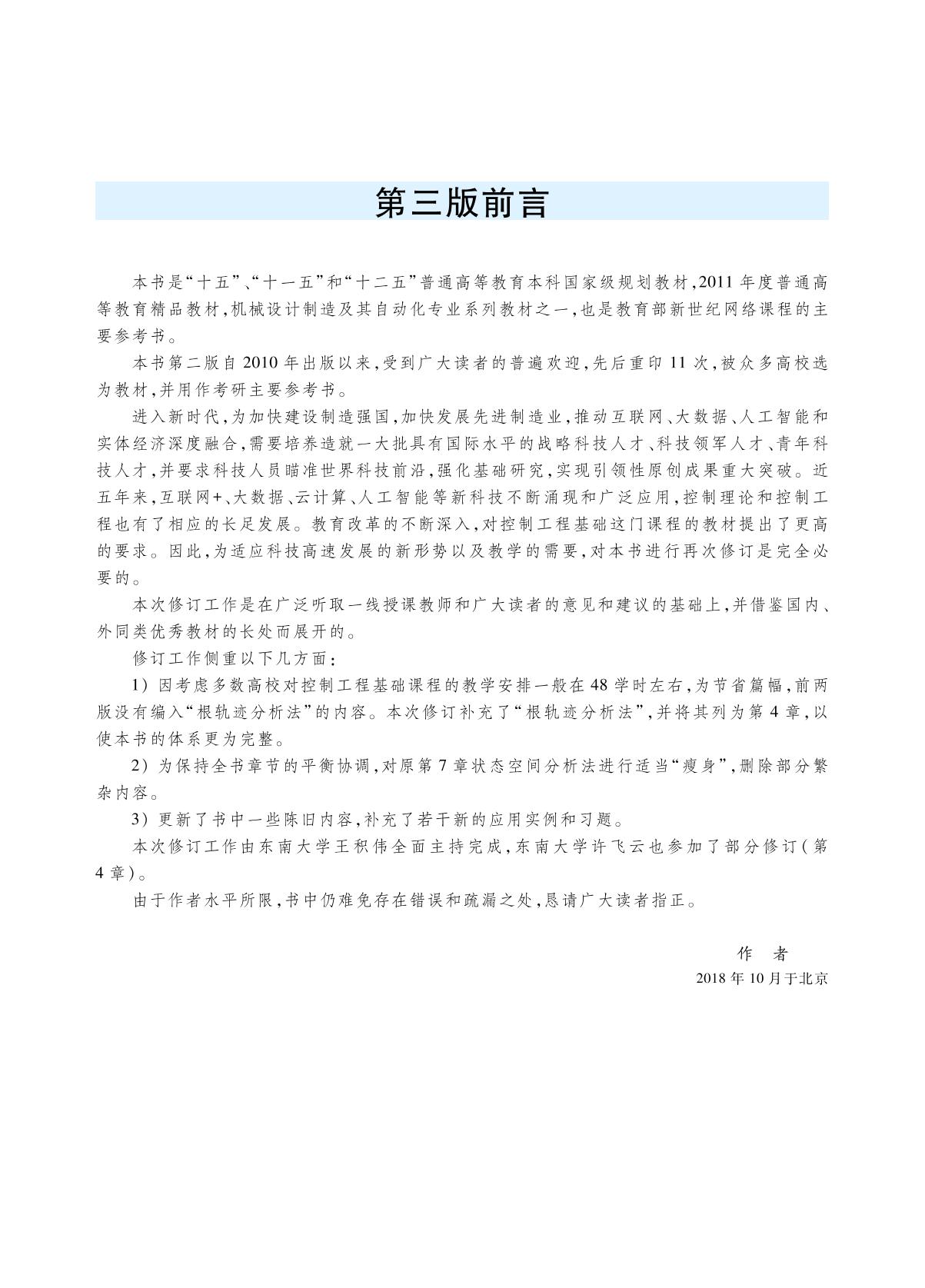 本书是“十五”、“十一五”和“十二五”普通高等教育本科国家级规划教材,2011年度普通高等教育精品教材,机械设计制造及其自动化专业系列教材之一,也是教育部新世纪网络课程的主要参考书。 全书共分9章:第1章控制系统的基本概念,第2章数学模型,第3章时域分析法,第4章根轨迹分析法,第5章频域分析法,第6章控制系统的设计和校正,第7章线性离散系统与Z变换,第8章状态空间分析法,第9章控制系统的应用和分析。书末附有5个附录。每章附有习题,附录E有部分习题参考答案。 本书的特点是:淡化经典控制与现代控制的界限,突出方法论;重点阐述共性问题,适应拓宽专业口径的需要;不苛求严格的数学推证,从直观的物理概念出发分析问题、解决问题;特别重视工程应用,除每章附有较多机、电、液、气方面的例题外,还专辟一章介绍控制理论在工程中应用的成功实例;取材新颖,采用MATLAB与SIMULINK等先进软件分析和设计系统;编写体系符合教学规律,好教易学;传授科学知识与培养创新能力并重。 本书可作为高等学校机械类专业控制工程基础课程的教材,也可供有关工程技术人员参考。 |