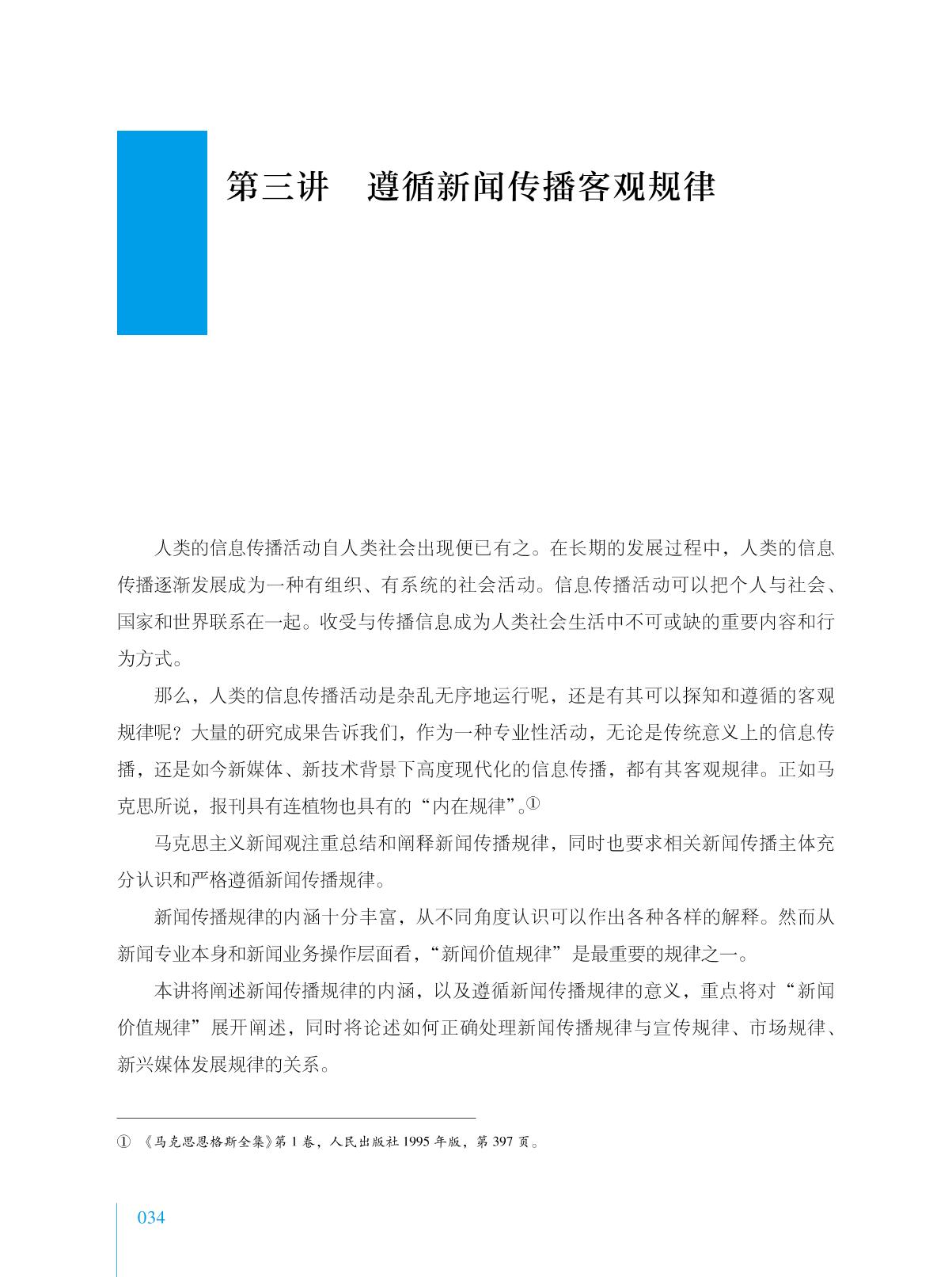 本书由中宣部、教育部共同组织编写,是国家社科基金特别委托项目“马克思主义新闻观研究”的最终成果。 本书对马克思主义新闻观一系列重要问题作了言简意赅的专题性论述。第一讲统领全书,论述了学习和践行马克思主义新闻观的背景、意义、方法,梳理了马克思主义新闻观产生及其中国化的发展进程。其他十一讲涉及新闻工作的基本要求、新闻传播的客观规律、新闻事业的根本性质、党性和人民性及其关系、舆论导向、正面宣传、新闻真实、新闻传播权利与社会责任、新闻法治与道德规范、传播新技术对新闻传播的影响、国际传播等一系列重要问题,由此构成了马克思主义新闻观理论和知识体系的有机整体。 本书既可作为高校新闻传播学及相关专业学生学习马克思主义新闻观的专门教材,也可以作为新闻媒体等相关单位进行马克思主义新闻观教育的培训教材和广大新闻从业人员的自学教材。 本书可与案例教材《实践中的马克思主义新闻观——新闻报道经典案例评析》配套使用。 |