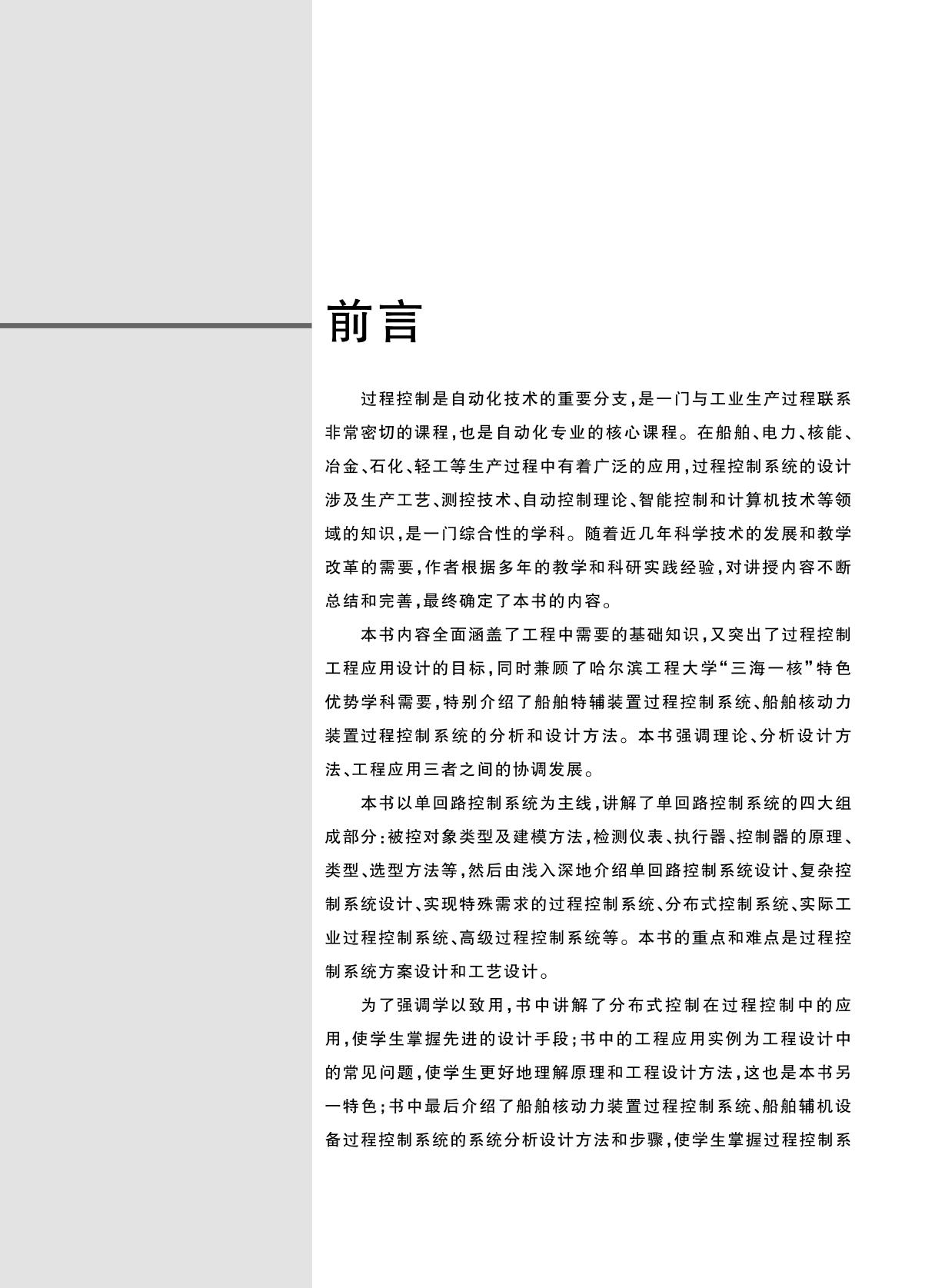 本书以单回路控制系统为主线,讲解了单回路控制系统的四大组成部分:被控对象类型及建模方法,检测仪表、执行器、控制器的原理、类型、选型方法等。然后由浅入深地介绍单回路控制系统设计、复杂控制系统设计、实现特殊需求的过程控制系统、分布式控制系统及分析设计实例、船舶核动力装置过程控制系统分析设计、船舶辅机设备过程控制系统、高级过程控制系统。全书共12章,每章均附有思考题与习题。书中配套有重难点讲解视频和扩展知识,适用于混合式教学和“翻转课堂”等新型教学模式改革的需要。 本书内容全面涵盖了工程中需要的基础知识,又突出了过程控制工程应用设计的目标,强调理论、分析设计方法、工程应用三者之间的协调发展。可作为电气类、自动化类、仪器仪表类等专业高年级本科生的教材,也可作为研究生的教科书及工程技术人员的参考书。 |