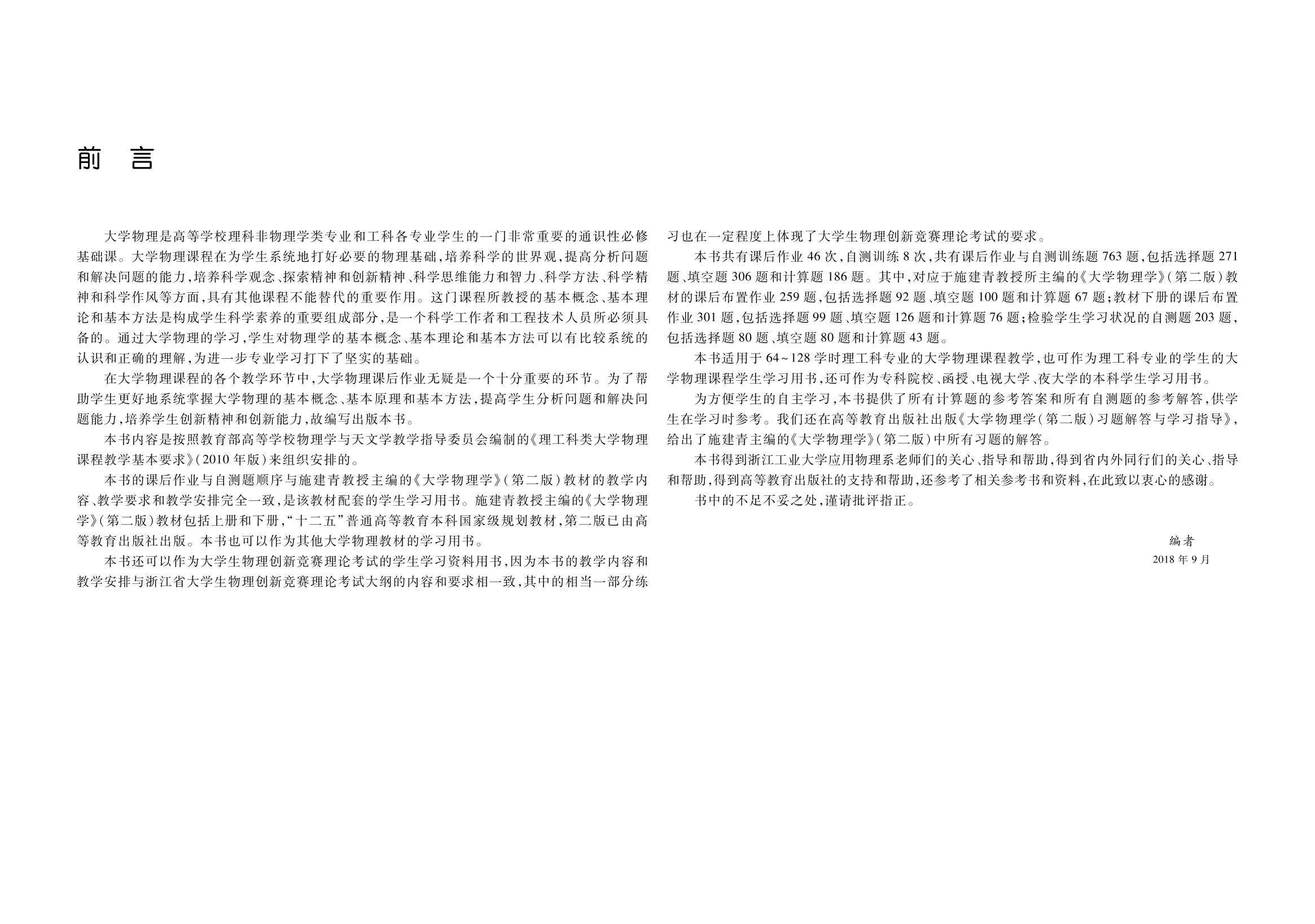 本书内容覆盖了教育部高等学校物理学与天文学教学指导委员会编制的 《理工科类大学物理课程教学基本要求》(2010年版)中全部的核心内容,主要用于配合施建青主编的《大学物理学》(第二版)的教学,也适用于同类型大学物理课程的教学。本书每个单元题目分选择题、填充题和计算题三种题型,并设置有自测训练题,供学生进行针对性的复习和自我检测。本书结合理工科专业教学的特点,紧扣学生必备的物理基础知识,注重学生对基本概念的理解和基础知识的应用,其特点是每个单元的题量不多,难度不大,但是包含了一定量的知识要点和解决物理问题的基本方法。 本书可作为高等学校理科非物理学类专业和工科各专业的大学物理练习册,也可供相关人员参考使用。 |