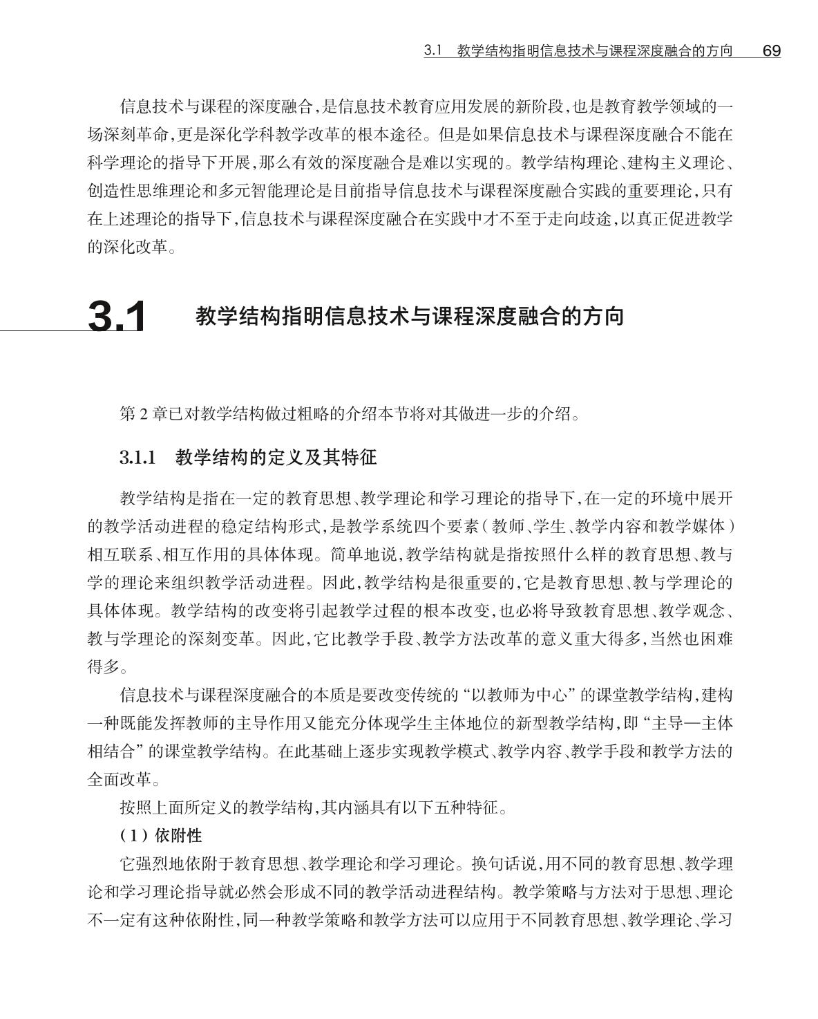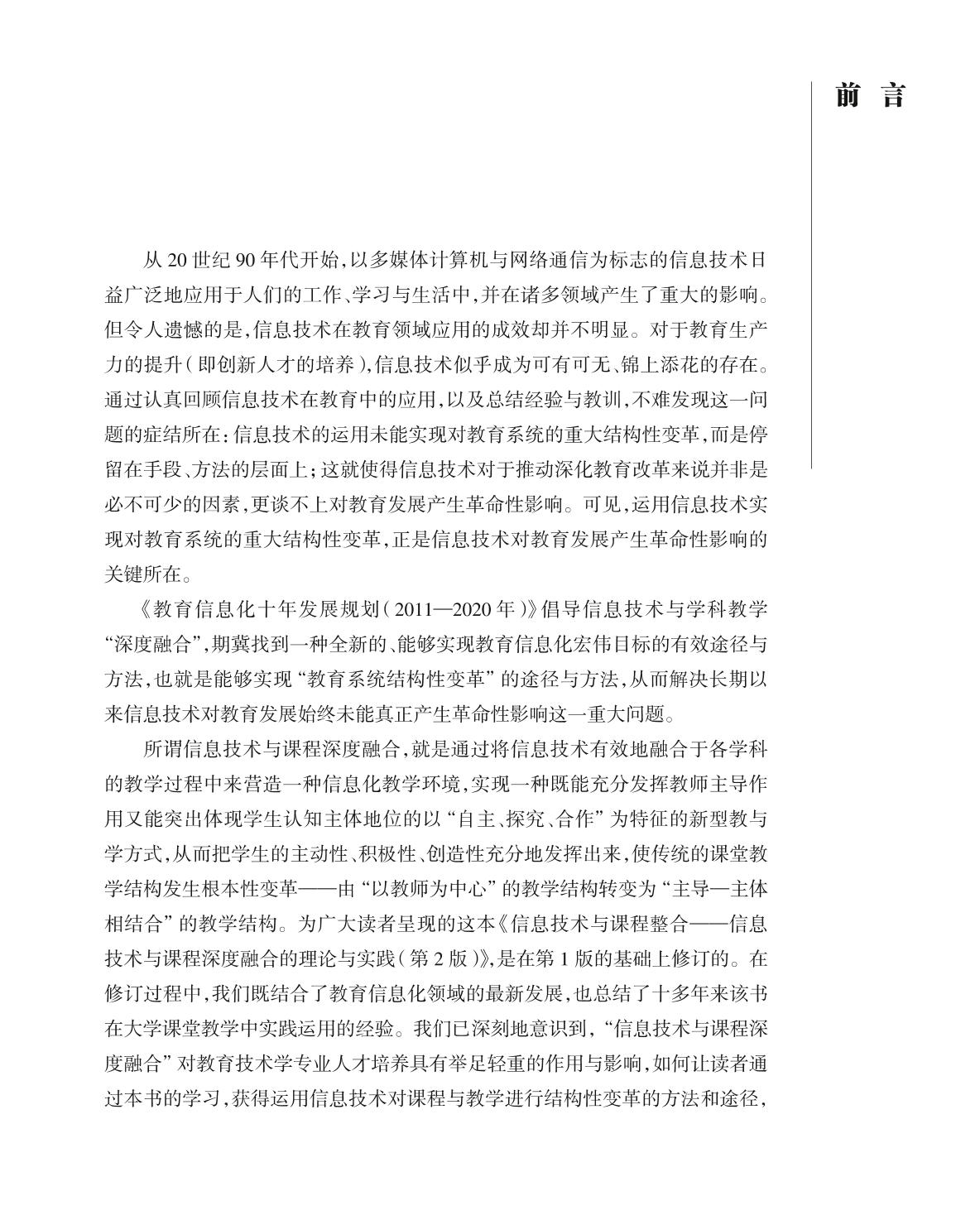 本书是高等学校教育技术系列教材之一。本书在编写过程中力求反映当前最新的教学改革成果和学科发展动向,并在内容和形式上体现较新的教育思想和教学观念。本书共分7章,主要内容包括信息技术与课程深度融合的背景、从信息技术与课程整合到信息技术与教育的深度融合、信息技术与课程深度融合的理论基础、信息技术与课程深度融合的实施准备、信息技术与课程深度融合的教学模式与案例分析、信息技术与课程深度融合的评价,以及信息技术与课程深度融合的展望。 本书既可作为高等学校教育技术学专业课程教材,也可作为高等学校师范类专业公共选修课教材,还可作为广大教师和教育技术工作者的参考用书。 |