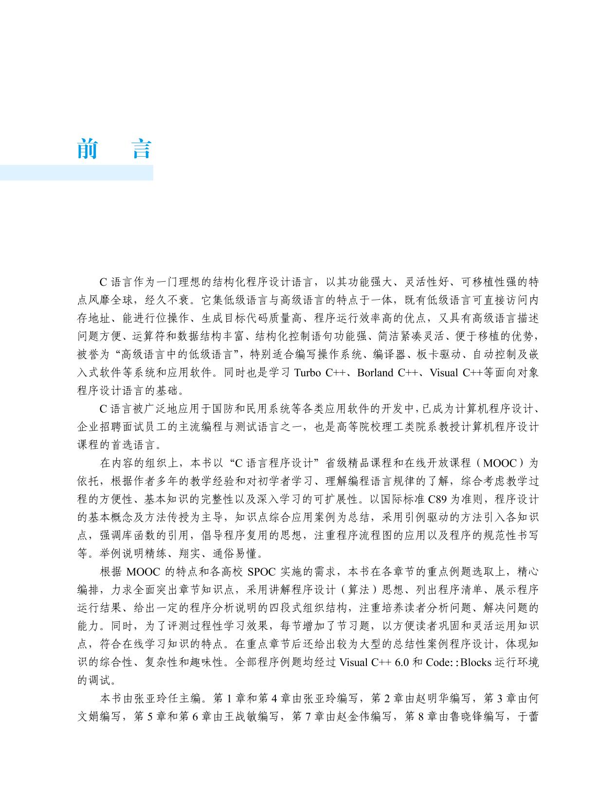 C 语言是计算机程序设计的主流语言之一,是目前大部分理工科院校开设程序设计课程的首选教学语言。 本书共分8 章,以国际标准C89 为准则,以程序设计的基本概念及方法为主导,详细、全面地介绍C 语言程序设计的基本结构、函数、数组、结构体与共用体、指针、文件等内容。强调库函数的引用,倡导程序复用的思想,注重程序流程图的应用以及程序书写的规范性等,突出重点章节总结性案例的知识综合性、复杂性和趣味性。 本书提供丰富的在线学习资源,内容深入浅出,循序渐进。 本书既可以作为高等院校程序设计基础课程的教材,又可作为工程技术人员与程序设计爱好者拓宽应用的参考书,同时也适用于自学读者阅读。 |