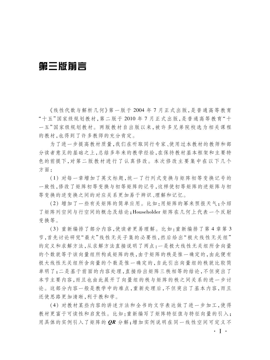 本教材是普通高等教育“十五” “十一五”国家级规划教材,内容包括:行列式、矩阵、几何向量及其应用、n维向量与线性方程组、线性空间与欧氏空间、特征值与特征向量、二次曲面与二次型、线性变换,共八章。部分章节还穿插介绍了如何使用MATLAB数学软件进行矩阵运算的相关命令。 本教材结构严谨,层次清晰,概念引入自然,内容编排符合认知规律,易于教师教和读者学。教材配置了丰富的例题与习题,部分题目选自近年来国内外优秀教材和全国硕士研究生入学统一考试数学试题。 本教材可作为高等理工院校非数学专业本科生的教材,也可供有关教师、科技人员和其他社会学习者阅读和参考。与本书对应的教学内容已在中国大学MOOC平台上线。 |