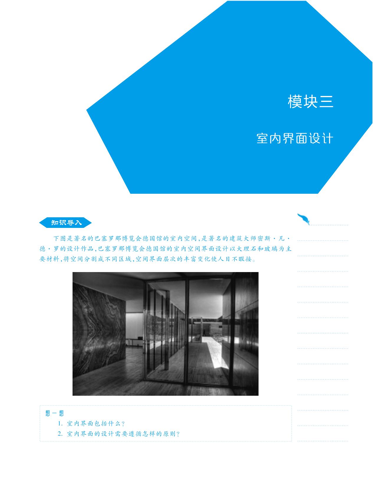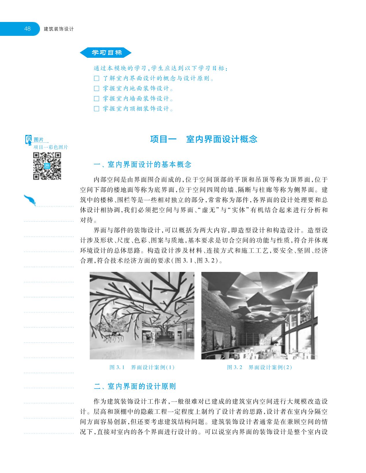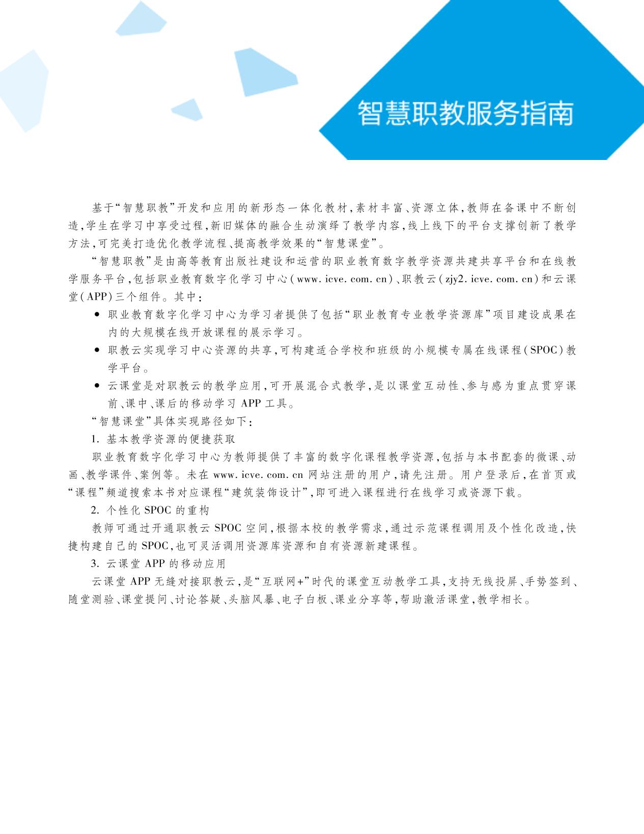 本书共分为八个模块:模块一为建筑装饰设计概论,模块二为室内空间组织设计,模块三为室内界面设计,模块四为室内照明设计,模块五为室内色彩设计,模块六为室内家具与陈设,模块七为室内绿化设计,模块八为室内专项设计。本书融合了丰富的配套数字课程资源,图文并茂、简明易懂、适用面广。 本书可作为高职院校建筑装饰工程技术专业、室内艺术设计专业、家具艺术设计专业的教学用书,也可作为建筑装饰工程技术人员、室内设计师与家具设计师的参考用书。 授课教师如需要本书配套的教学课件资源,可发送邮件至邮箱3290927848@qq.com索取。 |