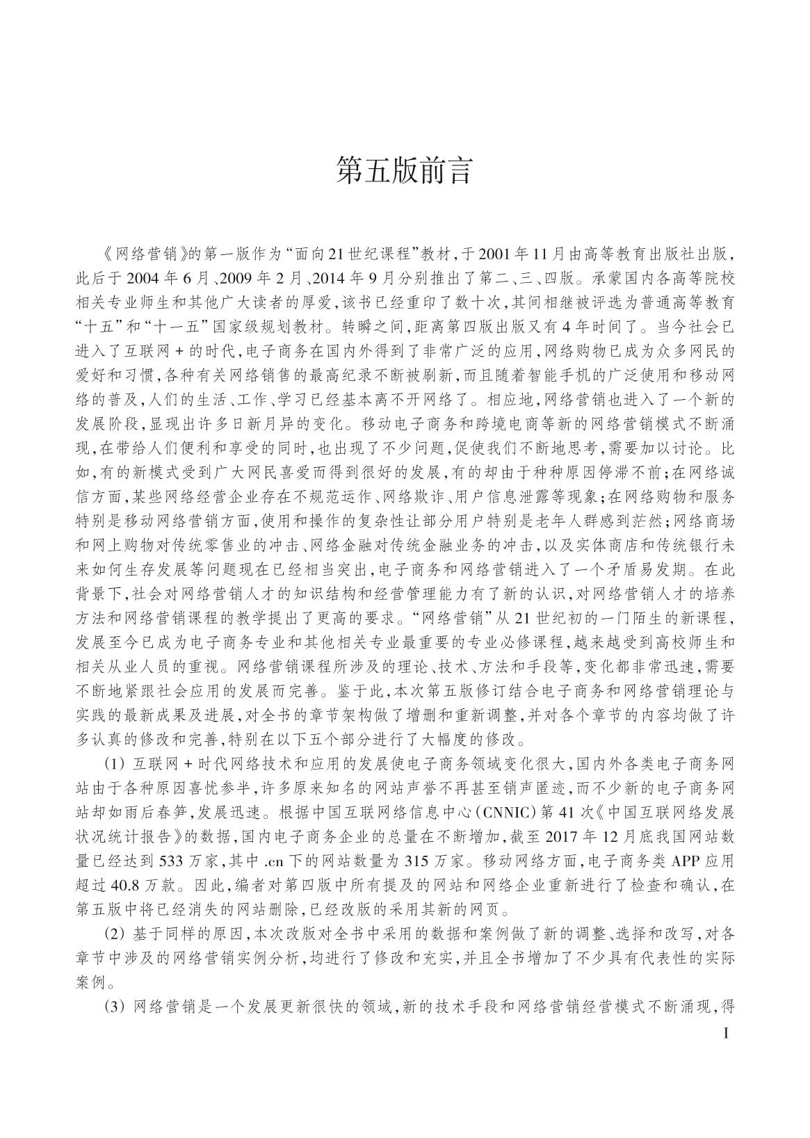 本书2001 年出版的第一版是“面向21 世纪课程”教材之一,本书的第二版和第三版相继被评为普通高等教育“十五”和“十一五”国家级规划教材。 本书在第四版基础上修改。全书共11 章,包括现代营销学原理、网络营销概述、网络营销的理论基础与环境、网络市场与消费者、网络营销企业战略规划、网络营销产品与价格策略、网络营销渠道、移动电子商务与移动网络营销、网络营销促销和广告等内容,全书最后分析了一些完整的网络营销成功案例。本书体系完整、结构严谨,强调理论与实践的结合,实际案例具有代表性,便于读者学习掌握网络营销的基本理论和实际运作的方法和策略。 本书可以作为高等院校电子商务专业课程教材,也可以作为经济与管理学科各相关专业新开设的网络化、信息化课程的教材,同时可以作为广大从事电子商务和网络营销实务的工作者的参考书。 |