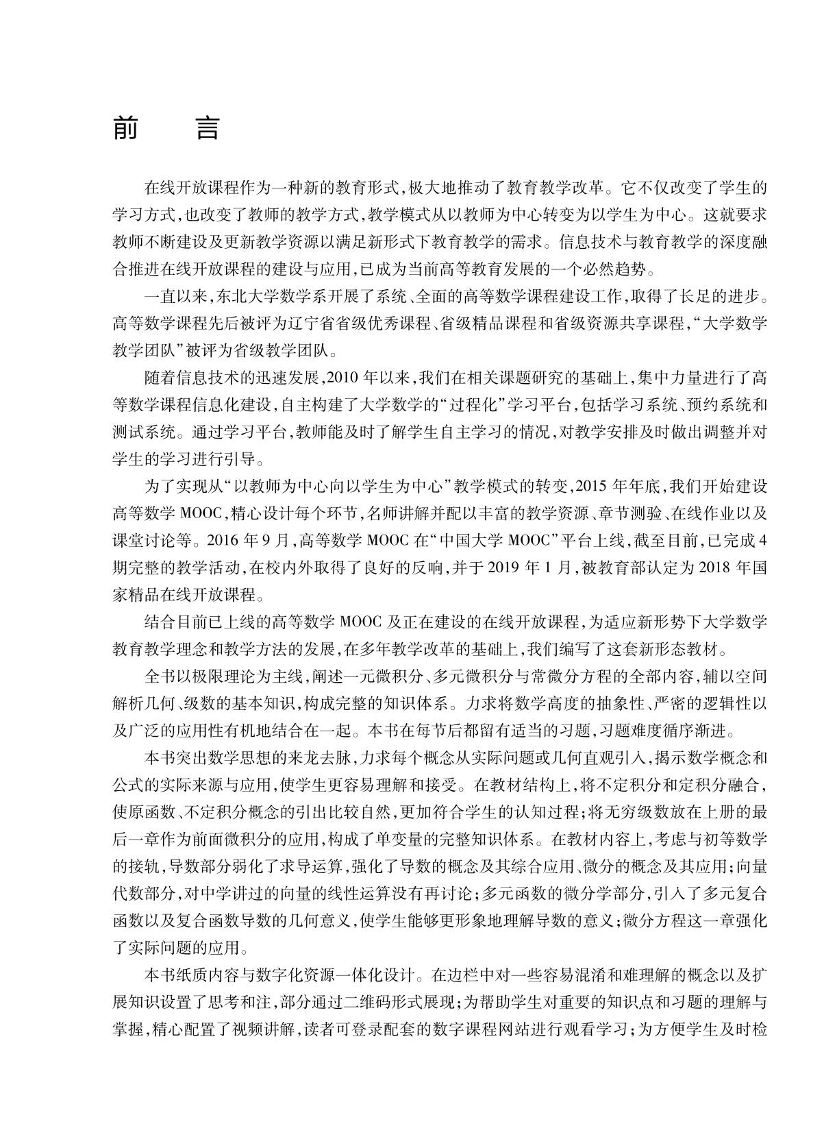 本书分上、下两册。上册包括极限与连续、导数与微分、微分中值定理与导数的应用、积分及其应用和无穷级数等内容。各章节均配有适当、适量的习题,难度循序渐进。 本书力求将数学高度的抽象性、严密的逻辑性以及广泛的应用性有机地结合在一起,突出数学思想的来龙去脉,力求每个概念从实际问题或几何直观引入,注重揭示概念和公式的实际来源与应用,使学生更容易理解和接受。 本书纸质内容与数字化资源一体化设计。精心设置了边注与思考题,为重要知识点及重点习题录制了视频讲解,并配有节自测题与章自测题。学习者可通过扫描二维码或登录数字课程网站获取。 本书既可作为高等学校理工类各专业高等数学课程的教材,也可供广大科技工作者或有兴趣的读者学习参考。 |