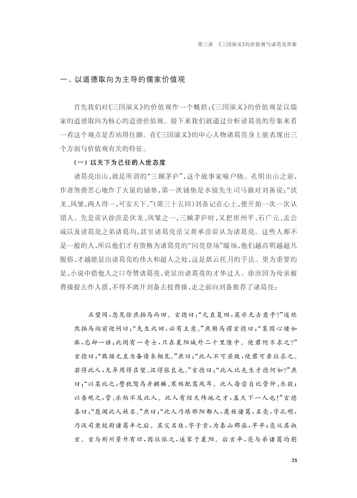 第一讲 《三国演义》的正统观与“拥刘反曹”思想1 一、正统溯源2 二、史学界关于三国的正统之争5 三、蜀汉正统与“拥刘反曹” 6 四、“拥刘反曹”思想形成的原因16 五、《三国演义》正统观及“拥刘反曹”思想的当代意义19 第二讲 《三国演义》的天命观20 一、天命的含义和天命观的由来20 二、《三国演义》天命观的表现特征23 三、天命观的评价32 第三讲 《三国演义》的价值观与诸葛亮形象 34 一、以道德取向为主导的儒家价值观35 二、乱世决定了特殊的入仕道路和价值选择44 三、统一、正统与个体价值的体现45 四、不以成败论英雄47 第四讲 《水浒传》与酒文化 48 一、英雄与酒49 二、《水浒传》中的酒俗65 第五讲 忠义思想与《水浒传》的招安结局69 一、令人郁闷的《水浒传》后半段69 二、纠结于忠义与招安的《水浒传》接受史71 三、《水浒传》成书过程中的招安75 四、招安是忠义思想加入的必然结局77 第六讲 江湖文化与《水浒传》的女性观84 一、历史上的侠与色84 二、《水浒传》中侠与色的对立86 三、江湖文化与《水浒传》的女性观99 第七讲 儒家文化与宋江形象 101 一、仁义宋江101 二、才智宋江104 三、忠孝宋江106 四、诚信宋江108 第八讲 西游记的“三教合一”思想115 一、“三教合一”的含义115 二、“三教合一”在小说中的表现116 三、“三教合一”是当时流行的社会思潮127 第九讲 心学与孙悟空形象 130 一、心学及其主要思想130 二、心学思想在《西游记》中的表现132 三、离经叛道的孙悟空135 四、如何理解心学与孙悟空的关系142 第十讲 小农思想与猪八戒形象 144 一、小农和小农思想144 二、猪八戒的性格特征145 第十一讲 禅宗与贾宝玉形象 161 一、禅宗及禅宗的主要思想161 二、贾宝玉形象与禅宗162 三、禅宗对贾宝玉性格的影响173 第十二讲 《红楼梦》中的满族文化 177 一、作者的满族文化背景177 二、《红楼梦》中的满族民俗178 三、《红楼梦》与萨满文化187 第十三讲 家国同构与《红楼梦》中的贾府 191 一、家长制192 二、贾府的治理197 三、贾府的经济201 四、贾府的政治斗争205 五、后继无人206 参考文献208