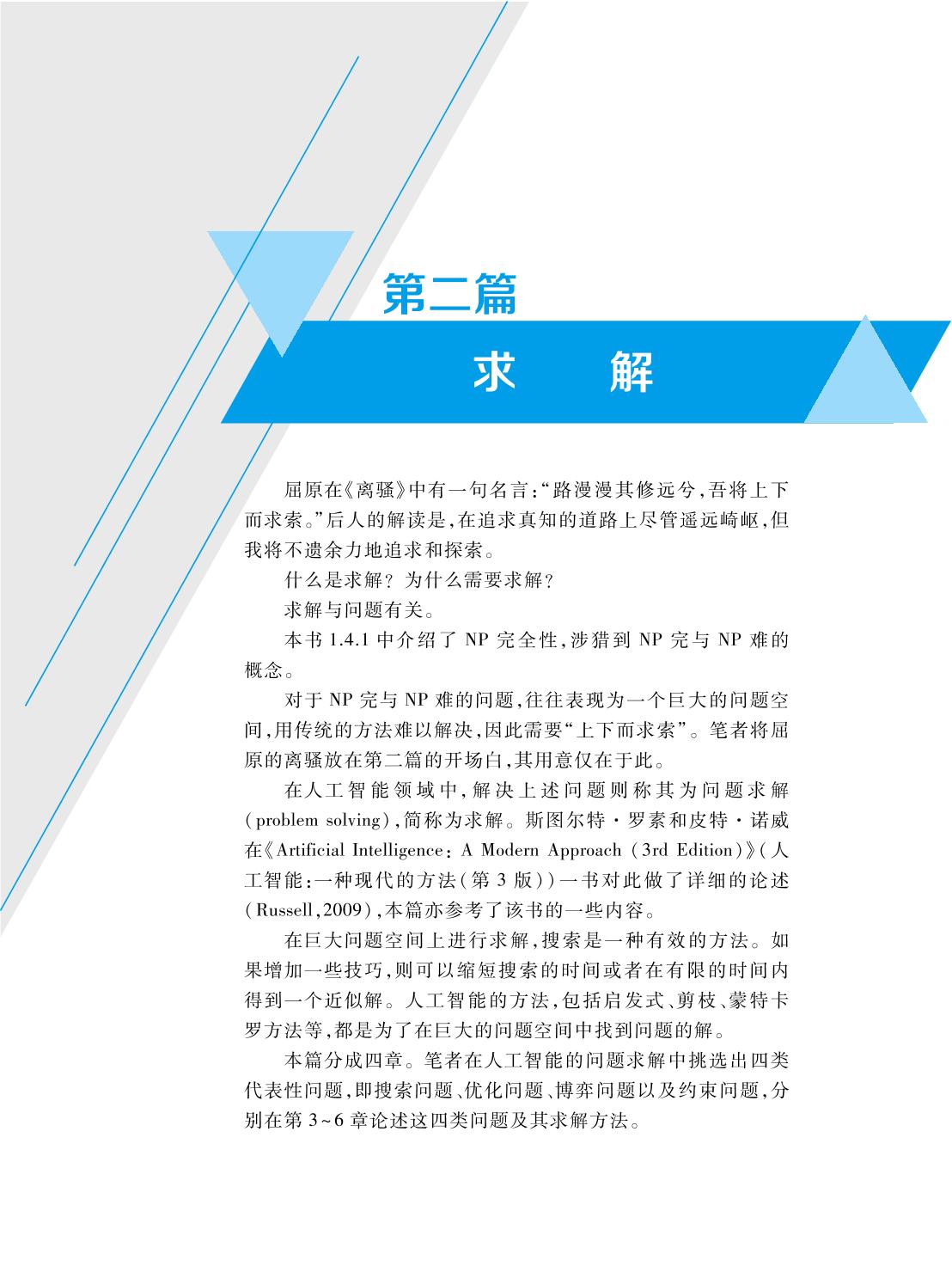 本书对人工智能学科及其研究领域进行抽象,梳理出一个人工智能的研究体系,然后按照这个体系讲述其原理,再穿插一些实例。全书分为五篇,共十四章。 这五篇分别是人工智能的体系、求解、规划、学习以及推理。 体系篇中有两章,即绪论与体系论。求解篇分成四章,讲述搜索问题、优化问题、博弈问题,以及约束问题求解。规划篇中有两章,分别是时空关联规划和决策理论规划。学习篇先用一章论述机器学习的三个视角,然后再用三章分别讲述学习的任务、范式以及框架。推理篇用两章分别介绍知识表示和推理机制。 本书可作为人工智能、计算机及其相关专业的高年级本科生或研究生的教材,也可作为人工智能的参考书,供有关教学和科研人员使用。 |