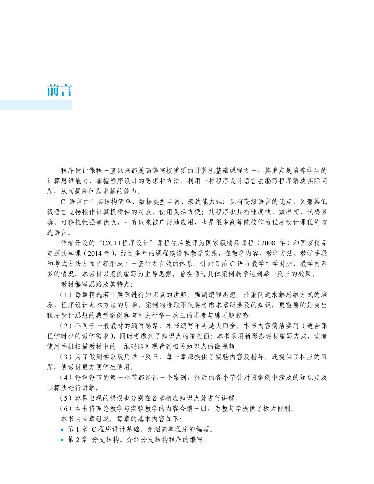 本书作为C语言程序设计课程的教材,共由9章组成。其主要内容包括:C程序设计基础、分支结构、循环结构、函数、数组、指针、结构体、文件、综合案例。每章后面都有实验内容及指导,并配有一定数量的习题。全书以案例进行知识点的讲解,内容安排紧凑、简明扼要、由浅入深,尤其适用于学时少、内容不减的教学,一本教材涵盖了理论教学、实验教学和课后练习三方面的内容,为教与学提供了极大的方便。 本书可作为本科院校非计算机专业本科生、研究生的相关课程教材,也可作为计算机专业学生学习C语言程序设计的教材,同时还可作为自学者参考用书。 |