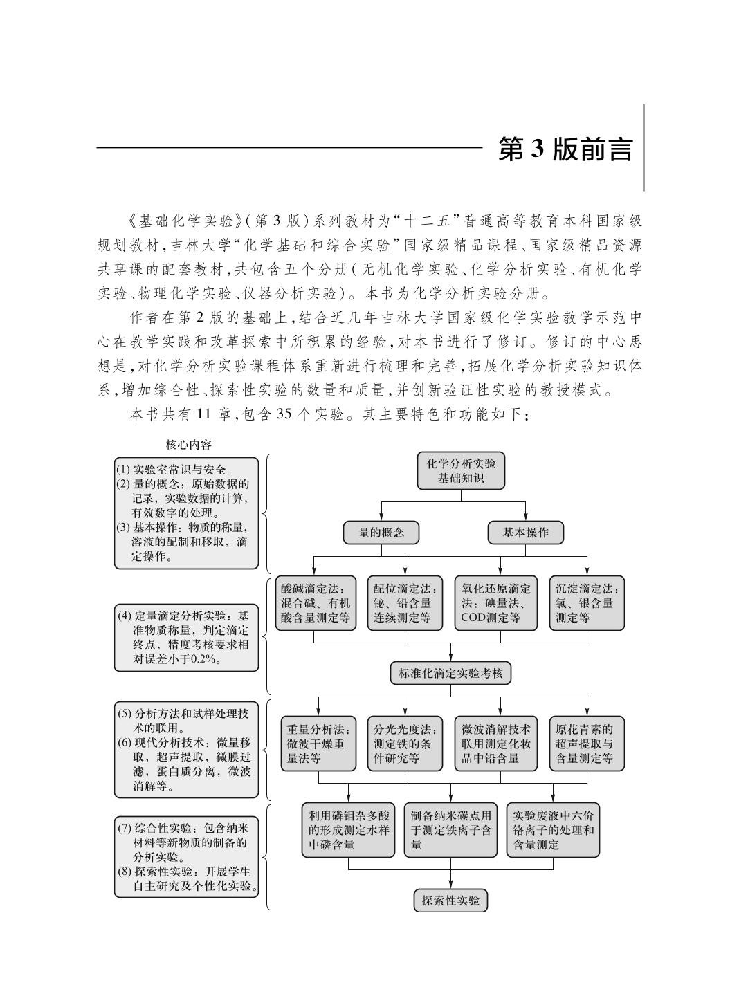 《基础化学实验》(第3版)为“十二五”普通高等教育本科国家级规划教材,分五册出版。本书为化学分析实验分册。 本书包括化学分析实验基础知识、量的概念、基本操作、酸碱滴定法、配位滴定法、氧化还原滴定法、沉淀滴定法、重量分析法、分光光度法、综合性实验和探索性实验,共11章内容。 本书可作为高等院校化学化工类专业及相关专业化学分析实验课程的教材和参考书。 |