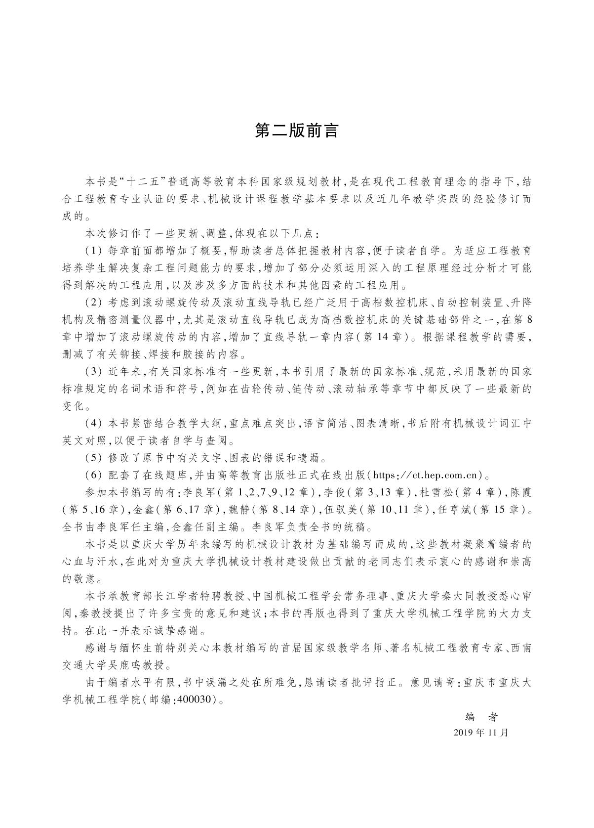 本书是“十二五”普通高等教育本科国家级规划教材。 本书是根据工程教育专业认证的要求及教育部高等学校机械基础课程教学指导分委员会制定的《机械设计课程教学基本要求》,结合教学实践经验,在第一版的基础上修订而成的。 本书共17章,第1~3章为机械设计概论、强度设计基本理论及摩擦学基本知识,探讨机械设计中的一些共性问题;第4~9章论述了各种机械传动的特性和设计方法,解决机械传动系统方案设计问题;第10~14章为轴系零部件的设计,解决机械结构设计问题;第15章和第16章分别为螺纹连接设计和弹簧设计;第17章为有限元方法在零件设计中的应用。 本书可作为高等学校机械类专业机械设计教材,也可供机械工程领域的研究生和有关科研、工程设计人员参考。 |