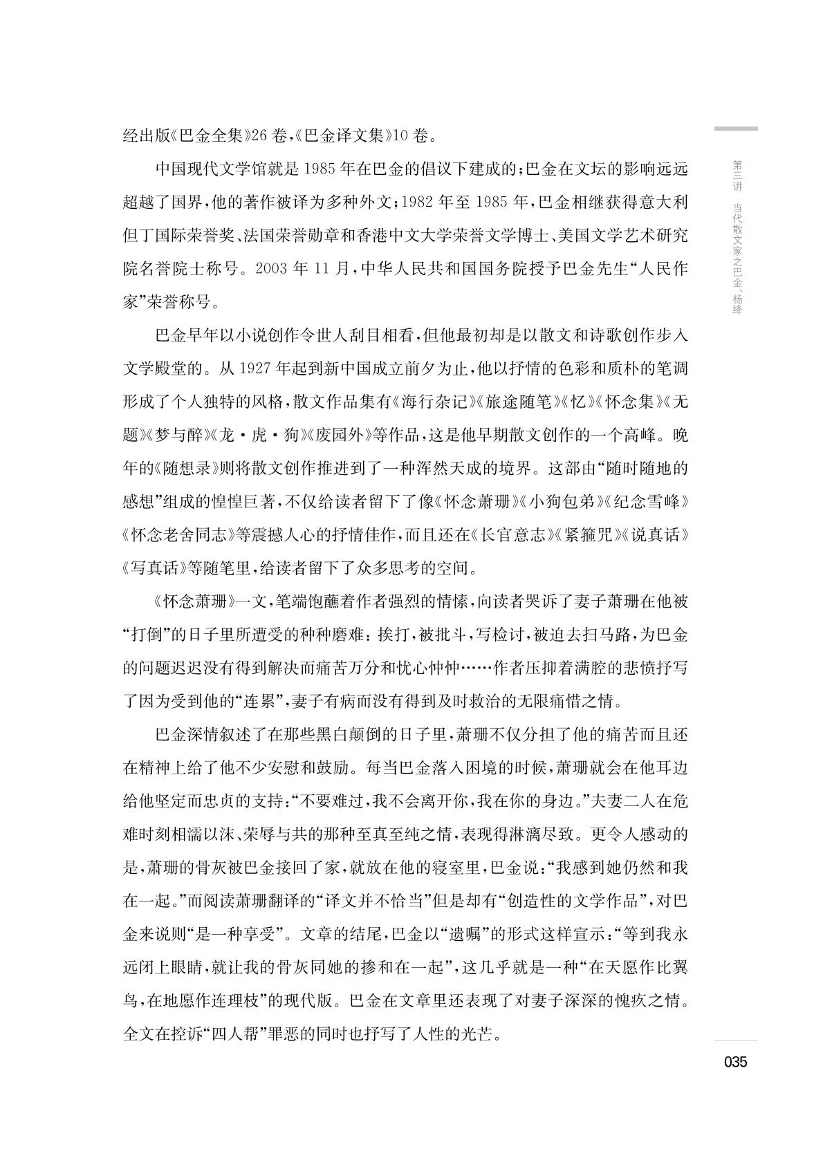 第一讲 莫言《红高粱》001 第一节 少年成长、乡村经验与现代精神的融合001 第二节 繁复交叉的叙事视角003 第三节 童心盎然与丰盈感觉007 第四节 “红高粱精神”辉耀大地011 第五节 中国经验:生命的英雄主义与生命的理想主义014 第二讲 李碧华《胭脂扣》017 第一节 李碧华及其创作017 第二节 跨界穿越的传奇叙事019 第三节 怀旧情结与香港意识022 第四节 现代意味的文化反思025 第五节 雅俗共融图文并生029 第三讲 当代散文家之巴金、杨绛034 第一节 巴金:真诚与真挚034 第二节 巴金对当代文坛的影响037 第三节 杨绛的“隐身哲学”040 第四节 平淡与机智、柔美与刚毅的有机结合042 第四讲 海子和昌耀的诗046 第一节 海子的意外死亡与海子神话046 第二节 海子的诗歌及其影响049 第三节 昌耀诗歌的自传性和美学特质055 第四节 昌耀诗艺的变化和对当代汉诗写作的意义060 第五讲 路遥《平凡的世界》064 第一节 经典现实主义理论与《平凡的世界》的契合065 第二节 时代大潮:农村土地制度改革由何而生066 第三节 改变城市:孙少平和“第一代打工仔”069 第四节 “编年史”与“风俗画”072 第五节 回望田野:乡村伦理和家庭伦理的重建076 第六讲 赵树理的小说079 第一节 赵树理的文学道路079 第二节 《小二黑结婚》导读081 第三节 《李有才板话》分析084 第四节 新颖的赵树理文学086 第五节 赵树理的文学史意义089 第七讲 艾青的诗歌093 第一节 艾青的生平与创作093 第二节 艾青诗歌的意象与主题095 第三节 艾青诗歌的“散文美”与节 奏102 第八讲 萧红《小城三月》111 第一节 翠姨:大雪、马车、坟111 第二节 现代小说家的伤春文学118 第三节 关于“小城”的两个“尾声”122 第九讲 曹禺的戏剧125 第一节 《雷雨》导读126 第二节 《日出》导读130 第三节 《原野》导读133 第四节 曹禺戏剧的现代性135 第十讲 徐志摩的诗歌139 第一节 传奇的诗性人生139 第二节 徐志摩诗歌创作的艺术成就143 第三节 诗的三美(上):《再别康桥》导读147 第四节 诗的三美(下):《偶然》等诗作导读150 第十一讲 周作人的小品文156 第一节 小品文笔调158 第二节 街头终日听谈鬼160 第三节 且谈草木虫鱼163 第四节 故乡的风物167 第十二讲 鲁迅的小说171 第一节 引论:鲁迅的生死爱恨171 第二节 《狂人日记》导读175 第三节 《阿Q正传》导读177 第四节 《在酒楼上》导读179 第五节 总结:《呐喊》《彷徨》的成就182 课堂问答选186