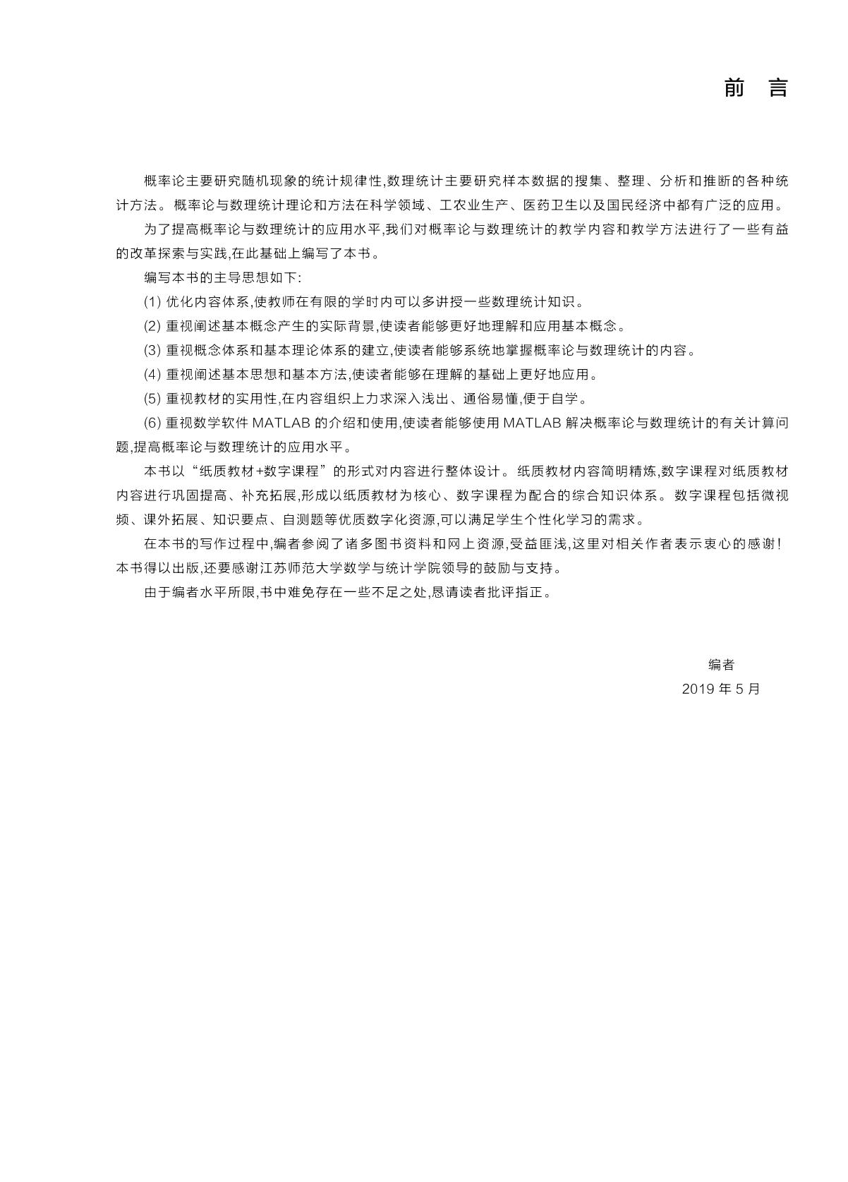 本书共8章,其中前3章是概率论部分,包括随机事件与概率、随机变量和随机向量;后5章是数理统计部分,包括数理统计的基础知识、参数估计、假设检验、方差分析和回归分析。本书前6章内容分为12个教学单元,每个教学单元均配有单元练习题,题型有填空题、选择题和解答题等。每章均配有综合练习题。此外,书末附有三个附录,其中附录A是MATLAB简介,附录B是常用统计分布表,附录C是概率论与数理统计模拟考试卷。 本书纸质教材与数字课程一体化设计,紧密配合,数字课程包括微视频、课外扩展、知识要点、自测题等优质数字化资源,便于辅助学生自主学习,满足学生个性化学习的需求。 本书可作为高等学校的概率论与数理统计教材,也可供科技工作者和广大师生参考。 |