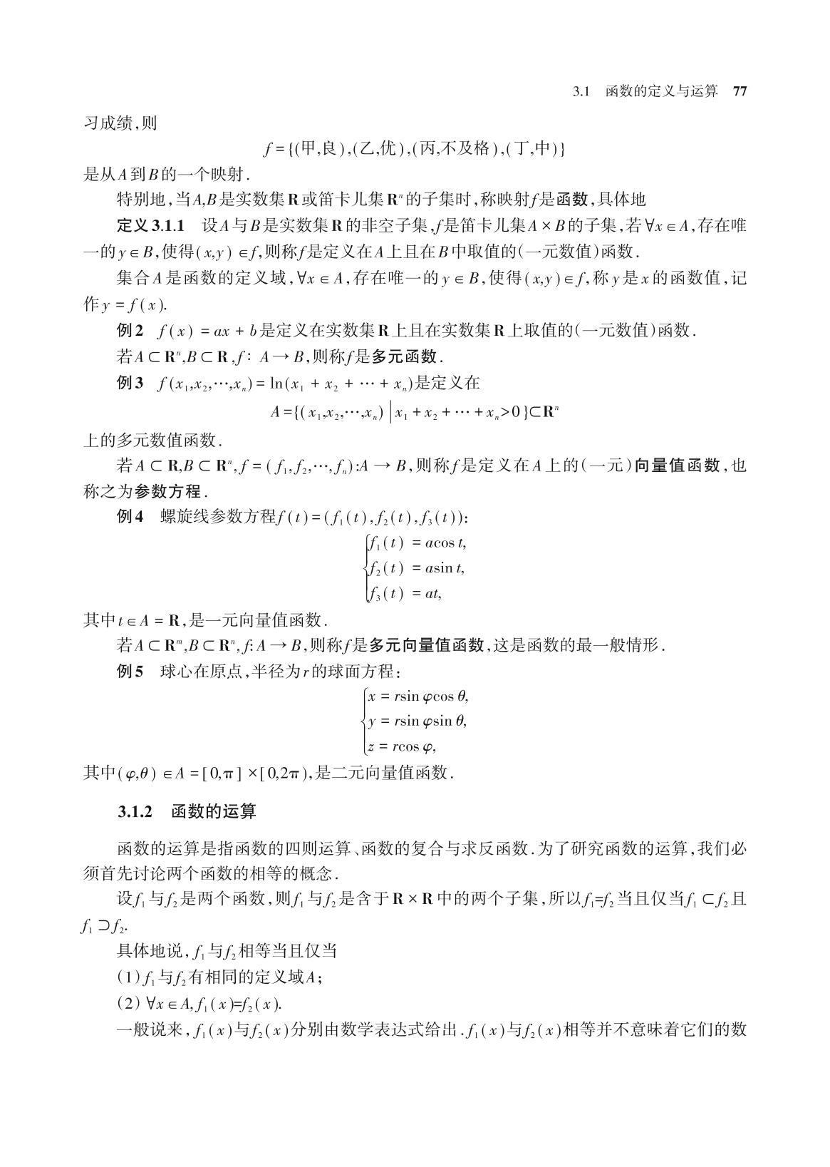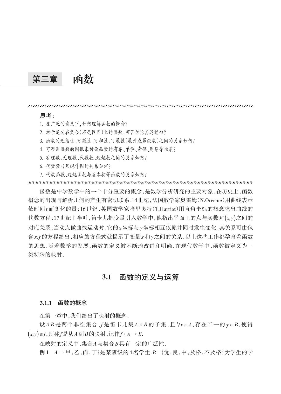 前辅文 第一章集合与关系 1.1 集合与逻辑 1.2 关系与映射 1.3 等价关系 1.4 序关系 1.5 等势关系 习题1 第一章自测题 附录1 集合论简史 第二章数与数组 2.1 自然数 2.2 整数 2.3 有理数 2.4 实数 2.5 复数 2.6 数组 2.7 几何图形的度量 习题2 第二章自测题 附录2 复数域还能扩大吗? 附录3 π是无理数的证明 第三章函数 3.1 函数的定义与运算 3.2 函数的分析性质 3.3 积分上限函数与和函数 3.4 函数的几何特征 3.5 超越函数 习题3 第三章自测题 附录4 π是超越数的证明 第四章多项式函数 4.1 幂函数的公理化定义 4.2 一次函数 4.3 二次曲线 4.4 方程 习题4 第四章自测题 第五章指数函数与对数函数 5.1 指数函数 5.2 对数函数 5.3 应用 习题5 第五章自测题 附录5 对数简史 第六章三角函数 6.1 三角函数的公理化定义 6.2 三角函数的分析性质 6.3 三角函数的公理化体系 6.4 三角函数的幂级数定义 6.5 中学三角函数的讨论 6.6 三角函数的应用 习题6 第六章自测题 第七章极值问题 7.1 凸函数与极值 7.2 一般函数的极值问题 *7.3 泛函极值与欧拉方程 7.4 欧拉方程积分法 7.5 等周问题 习题7 第七章自测题 参考文献 索引