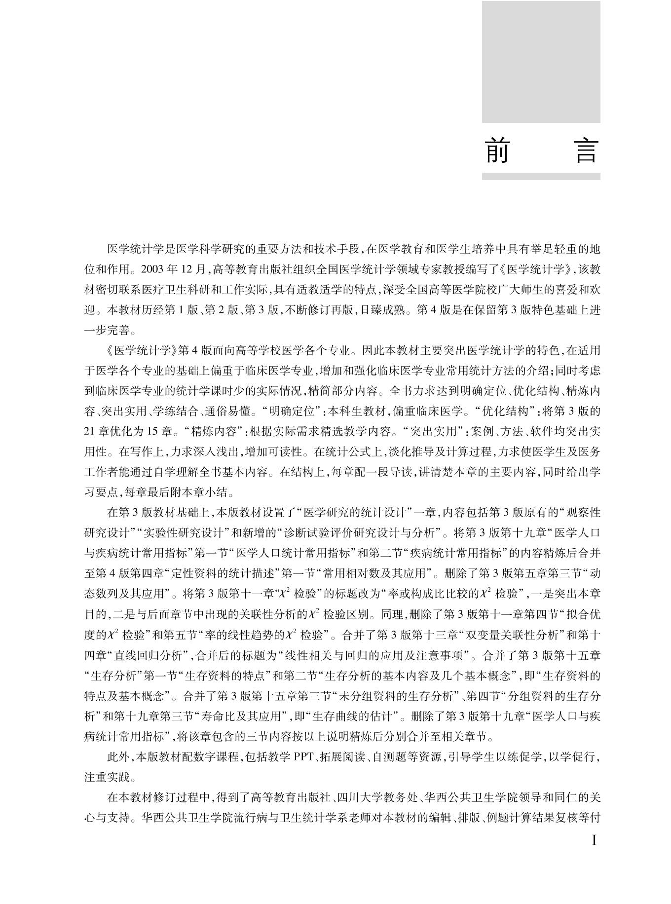 本教材共15章,内容涵盖了国家执业医师资格考试的全部知识点。本版教材对第3版部分章节进行了合并和精简,增加和完善了与教材内容相关的数字课程资源,着力突出对学生开展医学科学研究、进行研究设计、运用统计方法分析资料、应用统计软件实现数据管理和分析、正确解释和表达统计分析结果的综合能力培养。在文字上力求深入浅出、增加可读性。在统计公式上,淡化推导及计算过程,力求使医学生及医务工作者能通过自学理解全书基本内容。全书配数字课程,包括教学教教学、拓展阅读、自测题等资源,利于学生自主学习,提升教学效果。 本教材适用于临床、基础、预防、护理、口腔、检验、药学等专业的本科生,同时也可供研究生、临床医生及相关科研工作者参考使用。 |