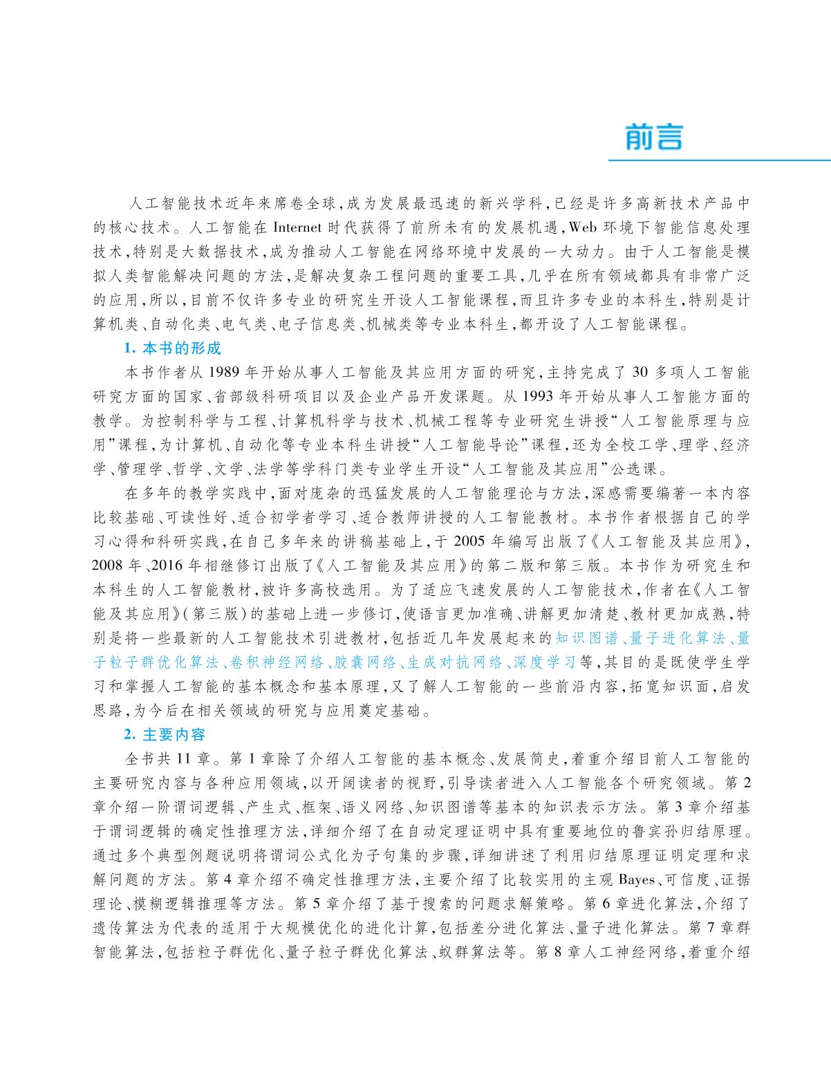 人工智能是解决复杂工程问题的重要工具,是许多高新技术产品中的核心技术。读者通过学习本书,能够掌握人工智能的基本内容,了解人工智能研究的一些最新的前沿内容,为深入研究与应用人工智能技术奠定基础。 全书共11章,分别为人工智能的基本概念与主要研究领域、知识表示与知识图谱、确定性推理方法、不确定性推理方法、搜索求解策略、进化算法(包括遗传算法、差分进化算法、量子进化算法)及其应用、群智能算法(包括粒子群优化算法、量子粒子群优化算法、蚁群算法)及其应用、人工神经网络(包括卷积神经网络、胶囊网络、生成对抗网络)及其应用、机器学习(包括深度学习)、专家系统、自然语言理解及其应用。附录中给出了本书习题的简要解答和实验指导书。 本书主要作为计算机类、自动化类、电气类、电子信息类、机械类等专业本科生、研究生,特别是智能科学与技术、人工智能、数据科学与大数据技术专业本科生学习人工智能基础课程的教材。由于书中几大部分内容相对独立,可以容易地根据课程计划学时选择部分内容学习,仍可保持课程体系结构的完整性。扫描本书二维码,能够观看相应内容的讲课录像,特别适合希望掌握人工智能技术的研究人员与工程技术人员自学。 |