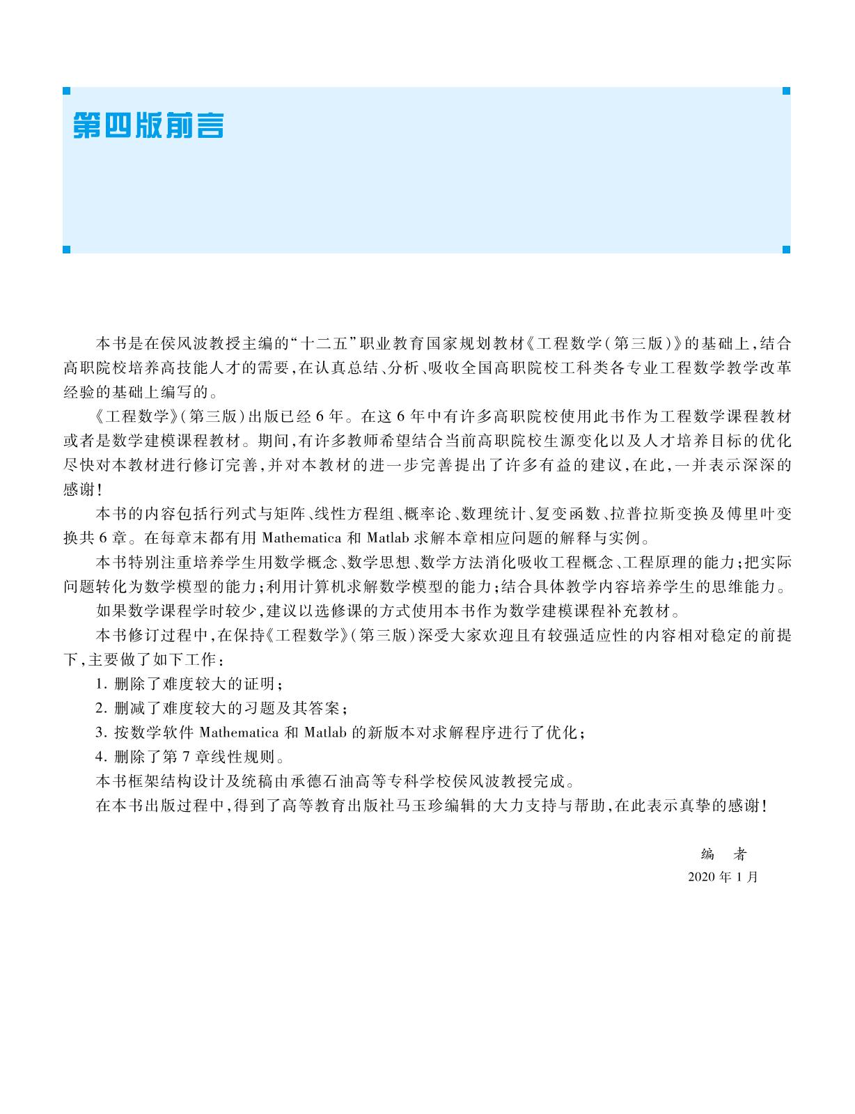 本书是在侯风波教授主编的“十二五”职业教育国家规划教材《工程数学(第三版)》的基础上,结合高等职业院校培养高技能人才的需要,认真总结、分析、吸收全国高职院校工科类各专业工程数学教学改革经验的基础上编写的。其内容包括行列式与矩阵、线性方程组、概率论、数理统计、复变函数、拉普拉斯变换及傅里叶变换共6章。本书特别注重培养学生用数学概念、数学思想、数学方法消化吸收工程概念、工程原理的能力,把实际问题转化为数学模型的能力,利用计算机求解数学模型的能力。在每章末的最后一节,都有用数学软件Mathematica与Matlab求解本章问题的解释与实例,便于训练读者学数学、用数学的能力。 本书可作为高职院校及成人高校工科类各专业工程数学课程的教材,也可作为高职院校学生数学建模知识的补充教材,还可供工程技术人员参考。 |