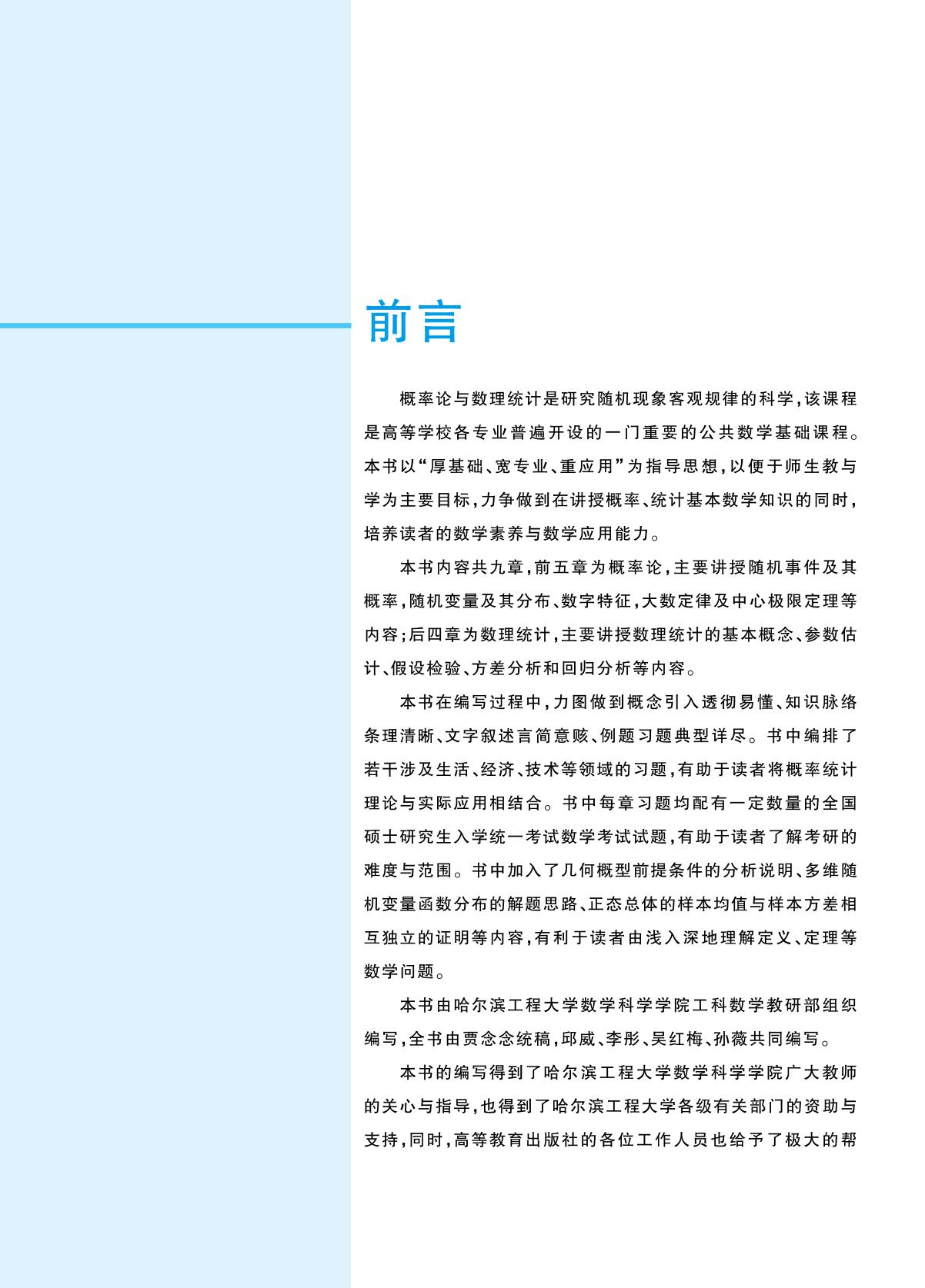 本书是哈尔滨工程大学编写的大学数学系列教材中的概率论与数理统计课程教材,主要内容包括随机事件及其概率、随机变量及其分布、多维随机变量及其分布、随机变量的数字特征、大数定律及中心极限定理、数理统计的基本概念、参数估计、假设检验、方差分析与回归分析等,每章配有习题及参考答案,且习题中加入了具有代表性的全国硕士研究生入学统一考试数学考试试题,有助于读者了解考研试题的难度与范围。 本书可作为高等学校非数学类各专业的教材或研究生入学考试的参考用书,也可供工程技术人员和科技人员学习参考。 |