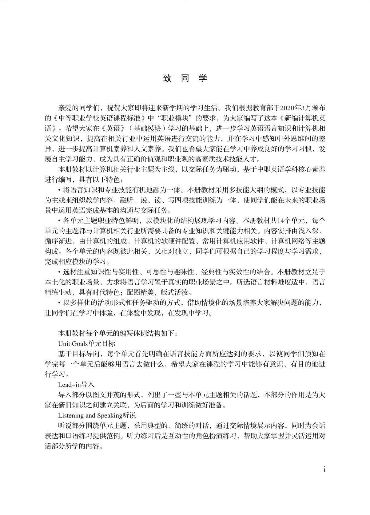 本书根据教育部新近颁布的《中等职业学校英语课程标准》中“职业模块”的要求进行编写。学生可在《英语(基础模块)》学习的基础上,进一步学习英语语言知识和计算机相关文化知识,提高在计算机行业中运用英语进行交流的能力,并在学习中感知中外思维间的差异,进一步提高计算机素养和人文素养。同时,培养学生良好的学习习惯,发展自主学习能力,成为具有正确价值观和职业观的高素质技术技能人才。 本册教材以计算机行业相关主题为主线,以交际任务为驱动,基于中职英语学科核心素养进行编写,具有以下特色: ? 将语言知识和专业技能有机地融为一体,采用多技能大纲的模式,以专业技能为主线来组织教学内容,融听、说、读、写四项技能训练为一体,使学生能在未来的职业场景中运用英语完成基本的沟通与交际任务。 ? 各单元主题职业特色鲜明,以模块化的结构展现学习内容。本册教材共14个单元,每个单元的主题都与计算机行业所需要具备的专业知识和关键能力相关。内容安排由浅入深、循序渐进,由计算机的组成、计算机的软硬件配置、常用计算机应用软件、计算机网络等主题构成。各个单元的内容既彼此相关,又相对独立,可根据学习程度与学习需求,完成相应模块的学习。 ? 选材注重知识性与实用性、可思性与趣味性、经典性与实效性的结合。立足于本土化的职业场景,力求将语言学习置于真实的职业场景之中。所选语言材料难度适中,语言精练生动,具有时代特色。配图精美,版式活泼。 ? 以多样化的活动形式和任务驱动的方式,培养大家在情境化的场景中解决问题的能力,让学生在学习中体验,在体验中发现,在发现中学习。 |