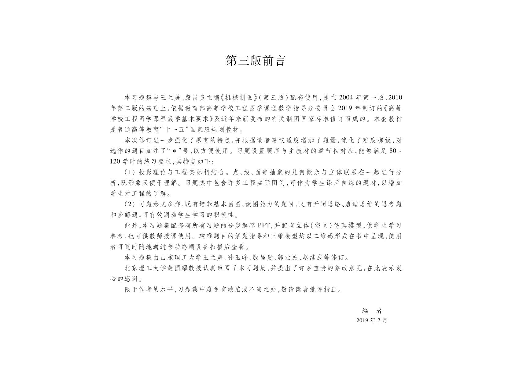 本习题集与王兰美、殷昌贵主编《机械制图》(第三版)配套使用,是在2004年第一版、2010年第二版的基础上,依据教育部高等学校工程图学课程教学指导分委员会2019 年制订的《高等学校工程图学课程教学基本要求》及近年来新发布的有关制图国家标准,全面考虑近几年教学发展情况及使用反馈意见与建议修订而成的。本套教材是普通高等教育“十一五”国家级规划教材。 本习题集可作为普通高等学校应用型本科机械类各专业机械制图课程的教材,亦可供其他类型学校相关专业选用。 |