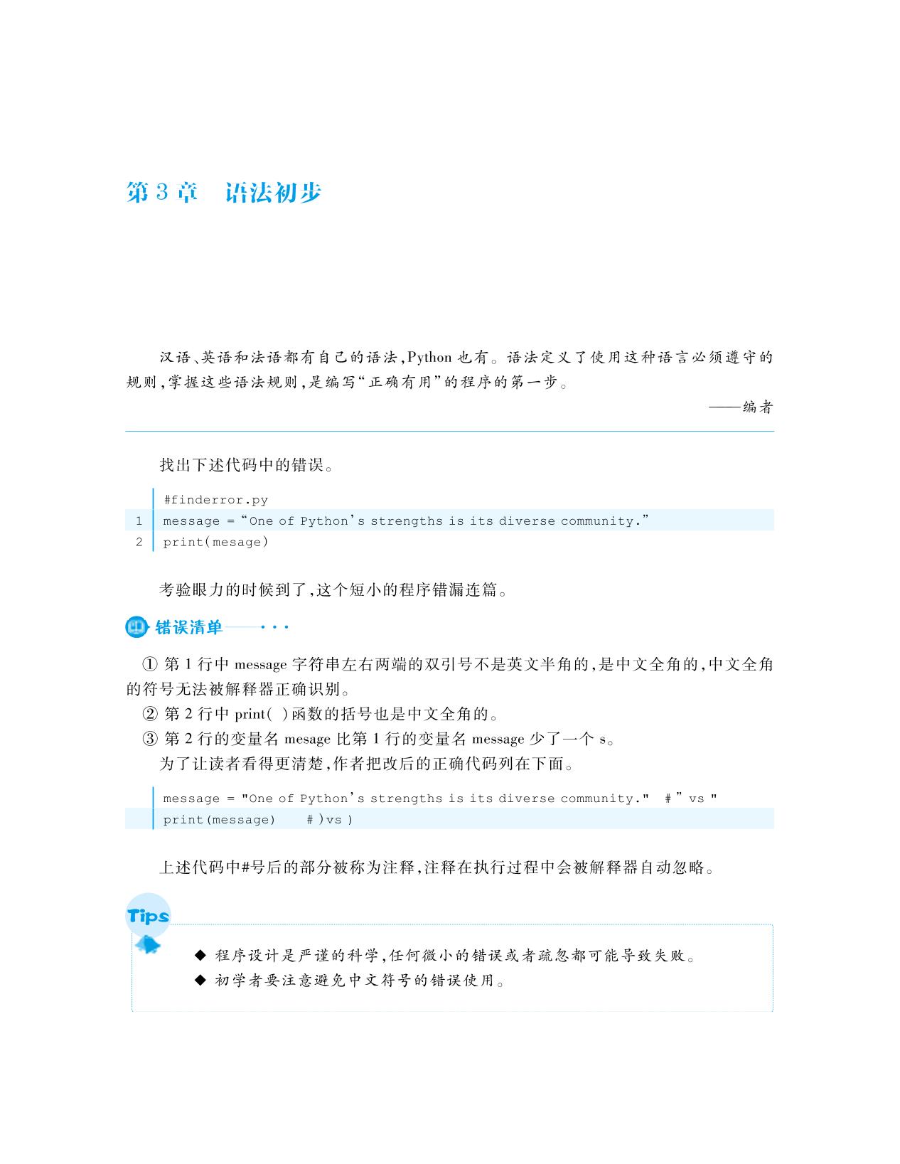 本书是作者在总结15年实际工程应用和教学经验基础上编著而成的,是一本为零基础读者准备的程序设计课程教材。通过阅读本书,读者可以掌握Python语言的基本语法,了解Python语言基础的算法及计算思维,并通过书中大量的实践案例,获得将编程知识应用于工程实践的体验。 本书内容简明扼要,涉及游戏、科学计算、人工智能等领域;案例生动有趣又紧贴实际,与数学、美术、文学、历史、通信、医学、经济学等专业紧密结合。全书共有18章和1个附录,第1~12章和附录A.1、A.2讨论Python语言的基础语法及应用;第13、14章和附录A.3讨论应用PyQt、pygame等模块进行基于Python的图形界面程序设计方法;第15~17章和附录A.4介绍将Python用于数据分析、科学计算及图表绘制的方法;第18章指导读者运用所学知识对全唐诗进行有趣的数据分析;附录A.5以图像风格迁移网络为例,简要介绍通过Python使用深度学习网络模型的方法及过程。 本书既可作为高等院校本科及专科计算机相关专业和非计算机专业学生的教学用书,也可作为Python语言爱好者的自学用书。 |