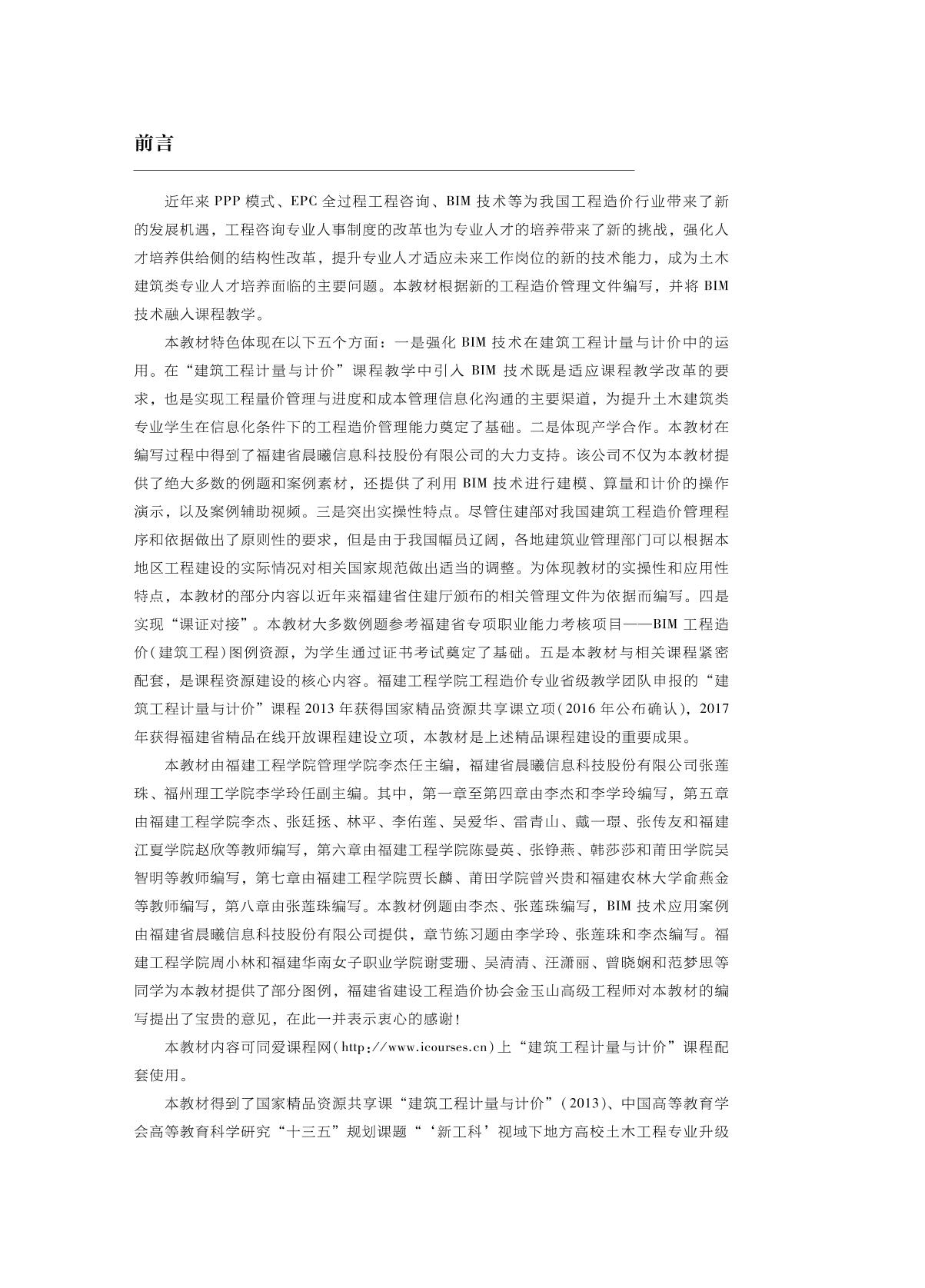 本教材根据《建筑工程建筑面积计算规范》(GB/T 50353—2013)、《关于调整增值税税率的通知》(财税〔2018〕32号)等工程造价管理文件编写。内容包括工程计量与计价基础、建筑工程计价依据、建筑工程工程量清单计价方法、建筑面积计算规范、房屋建筑工程计量与计价、装饰装修工程计量与计价、措施项目和其他项目计量与计价、工程计价软件操作。其中,在房屋建筑工程计量与计价、装饰装修工程计量与计价、措施项目和其他项目计量与计价3章的部分例题旁,设有二维码关联相应BIM计价视频/BIM建模视频,供读者参考,以便进一步学习和实际应用所学知识。 本书可以作为高等院校工程管理、工程造价、建筑学、土木工程、房地产开发与管理、审计学(工程审计方向)、会计学(建筑会计方向)和建筑工程技术等本专科专业教材,还可以作为一级造价工程师和二级造价工程师业务培训用书,以及建筑工程经济管理专业人员学习参考用书。 |