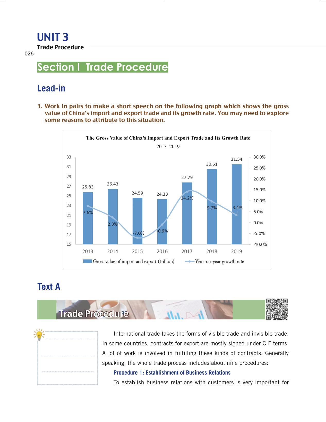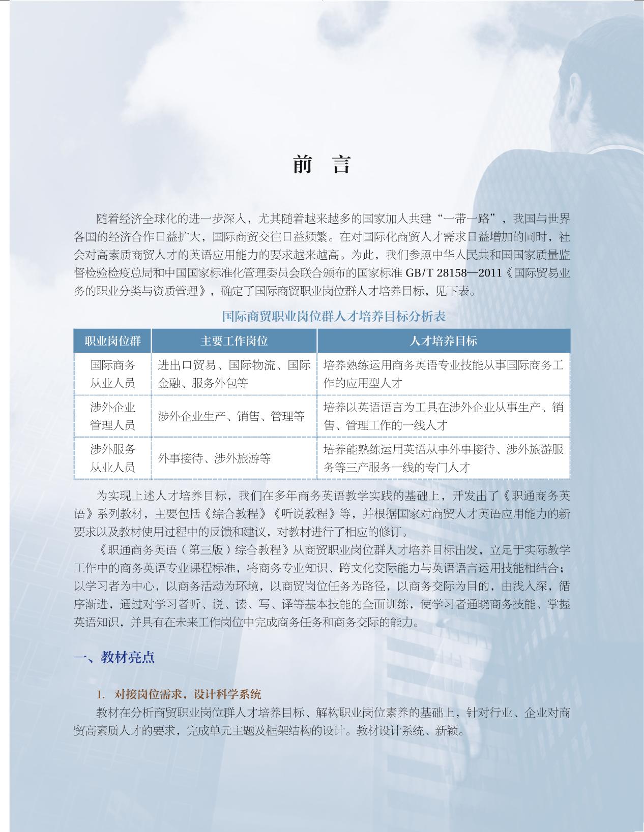 《职通商务英语》第一版于2010年出版,第二版于2016出版,为“十二五”职业教育国家级规划教材。教材自面世以来,以其优良的品质、新颖的编排和科学的设计得到了师生们的一致好评。为适应时代的不断发展和新时期对国际商贸人才的更高要求,编者团队完成了对教材的第二次修订。第三版教材立足于实际教学工作中的商务英语专业课程标准,将商务专业知识、跨文化交际能力与英语语言运用技能相结合;以学习者为中心,以商务活动为环境,以商贸岗位任务为路径,以商务交际为目的,由浅入深,循序渐进,通过对学习者听、说、读、写、译等基本技能的全面训练,使学习者通晓商务技能、掌握英语知识,并具有在未来工作岗位中完成商务任务和商务交际的能力。 本册为《职通商务英语(第三版)综合教程3》,配备二维码音频资源及《教师参考书3》(电子版),包含 8 个教学单元,主要涉及贸易实务、国际市场、贸易流程等内容。各单元体例基本统一,由学习目标、课文精读、补充阅读等模块构成。 |