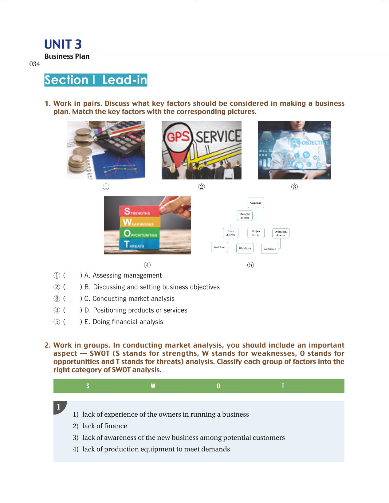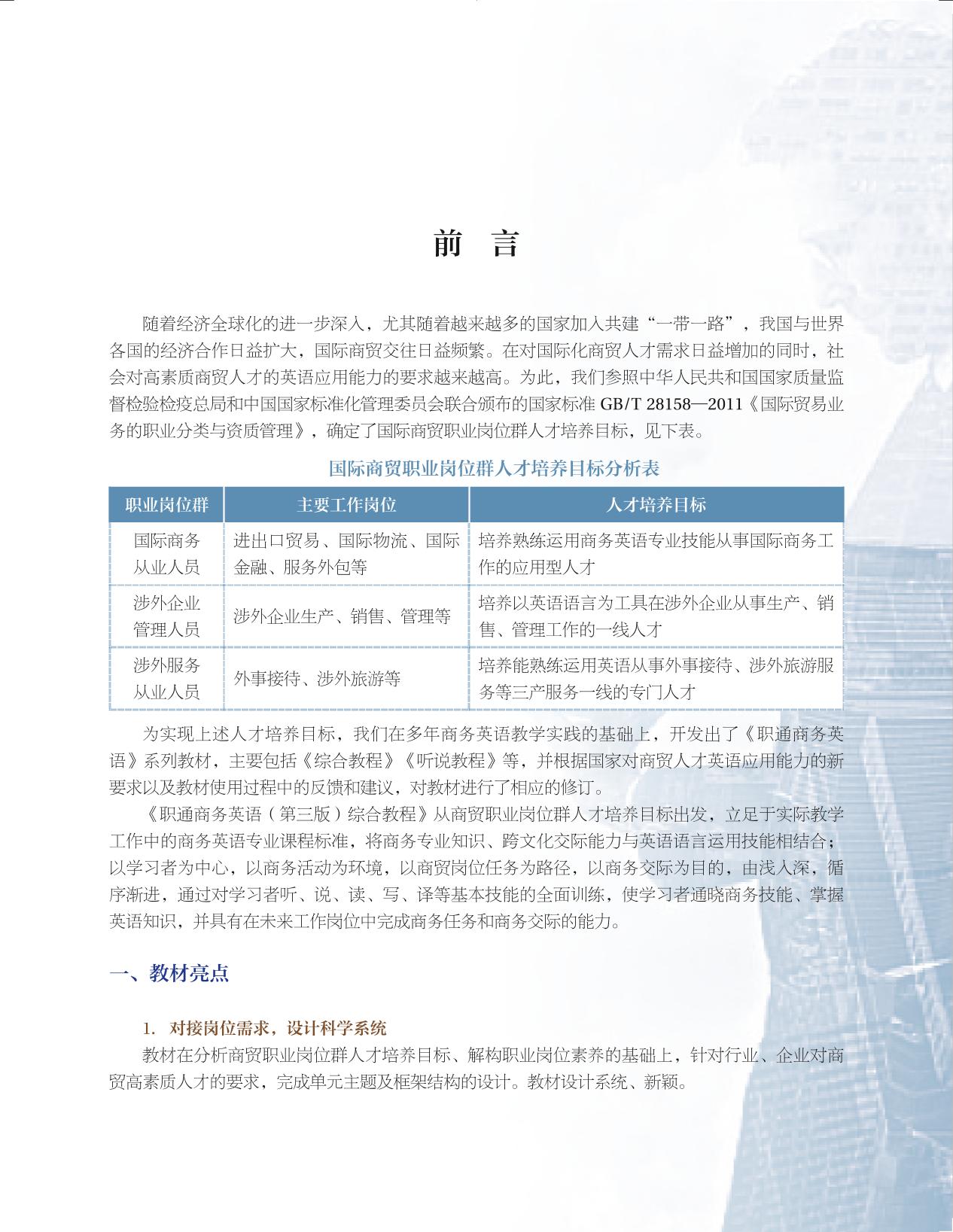 《职通商务英语》第一版于2010年出版,第二版于2016出版,为“十二五”职业教育国家级规划教材。教材自面世以来,以其优良的品质、新颖的编排和科学的设计得到了师生们的一致好评。为适应时代的不断发展和新时期对国际商贸人才的更高要求,编者团队完成了对教材的第二次修订。第三版教材立足于实际教学工作中的商务英语专业课程标准,将商务专业知识、跨文化交际能力与英语语言运用技能相结合;以学习者为中心,以商务活动为环境,以商贸岗位任务为路径,以商务交际为目的,由浅入深,循序渐进,通过对学习者听、说、读、写、译等基本技能的全面训练,使学习者通晓商务技能、掌握英语知识,并具有在未来工作岗位中完成商务任务和商务交际的能力。 本册为《职通商务英语(第三版)综合教程 1》,配备二维码音频资源及《教师参考书 1》(电子版),包含 8 个教学单元以及 2 个复习单元。各教学单元体例基本统一,由任务导入、课文精读、语言要点、商务写作等模块构成。 |