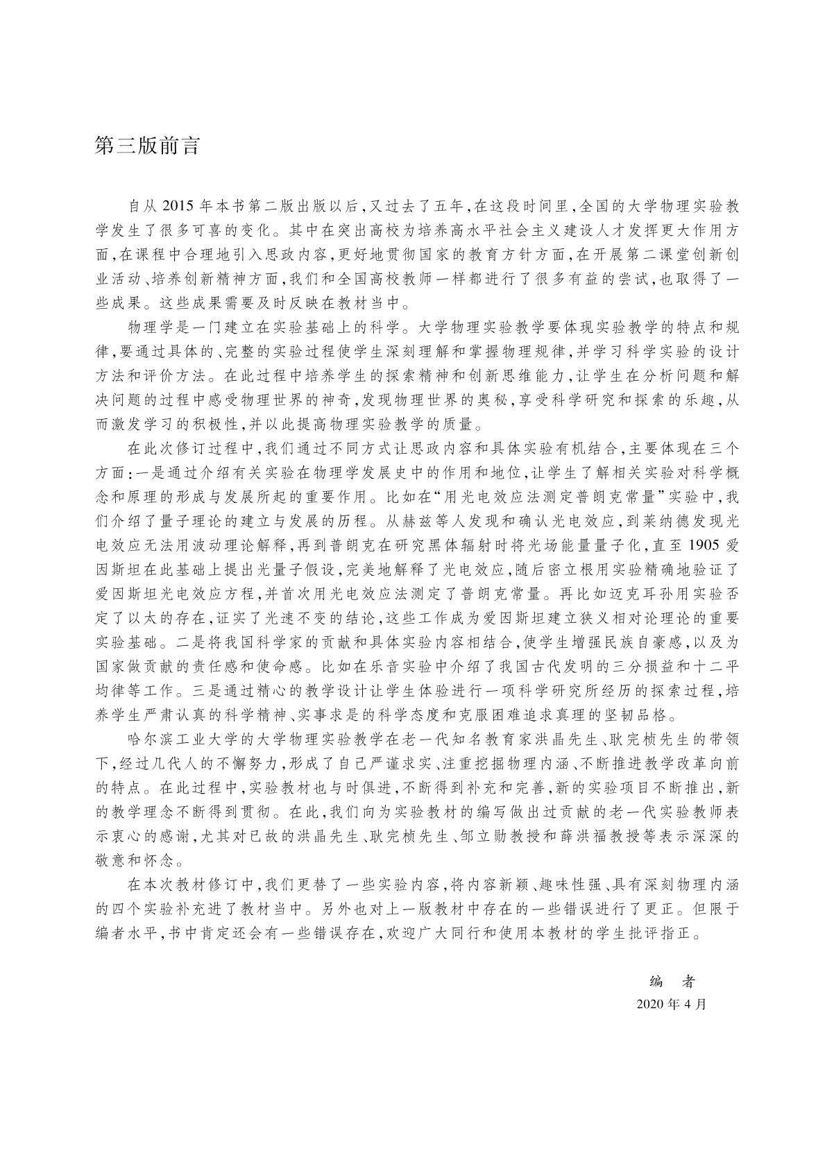 前辅文 第一章 基本知识 第一节 测量与误差 第二节 误差的分类 第三节 随机误差的处理 第四节 系统误差的处理 第五节 测量结果的不确定度 第六节 直接测量量的结果表示 第七节 间接测量量的结果表示 第八节 有效数字及其运算规则 第九节 实验数据的列表法、图示法与图解法 第十节 用逐差法处理实验数据 第十一节 用最小二乘法处理数据 第十二节 力学实验基本知识 第十三节 电磁学实验基本知识 第十四节 光学实验基本知识 第十五节 习题 第二章 基础性实验 实验一 碰撞打靶实验 实验二 用拉伸法测定弹性模量 实验三 蛇摆的设计与制作 实验四 刚体的转动惯量 实验五 液体黏度的测定 实验六 液体表面张力的测定 实验七 克拉尼图——二维振动的可视化探究 实验八 耦合摆实验 实验九 PN结正向电压温度特性的研究与应用 实验十 线性与非线性元件伏安特性的测定 实验十一 用惠斯通电桥测电阻 实验十二 补偿原理和电位差计 实验十三 示波器的原理和应用 实验十四 载流圆线圈和亥姆霍兹线圈磁场分布的测定 实验十五 RL、RC和RLC电路稳态特性研究 实验十六 RLC串联电路的暂态过程 实验十七 非平衡电桥及电阻温度系数的测定 实验十八 DIY实验——磁耦合谐振式无线电力传输实验研究 实验十九 薄透镜焦距的测定 实验二十 分光计的调节和用衍射光栅测定光的波长 实验二十一 用自组焦距仪测定透镜的焦距 实验二十二 光的等厚干涉现象与应用 实验二十三 用光干涉法测定金属热膨胀系数 实验二十四 单缝和圆孔的夫琅禾费衍射 实验二十五 自组显微镜和望远镜 第三章 综合性实验 实验二十六 用动力学法测定金属材料的弹性模量 实验二十七 用波尔共振仪研究受迫振动 实验二十八 用准稳态法测定不良导体的比热容和导热系数 实验二十九 测定空气中的声速 实验三十 太阳能电池的基本特性研究 实验三十一 用示波器观测动态磁滞回线 实验三十二 霍尔效应 实验三十三 金属电子逸出功的测定 实验三十四 用双光栅衍射检测微振动 实验三十五 棱镜材料色散关系的研究 实验三十六 迈克耳孙干涉仪 实验三十七 偏振光的获得与检验 实验三十八 蔗糖溶液旋光性的研究 实验三十九 用法布里-珀罗干涉仪测定光的波长差 实验四十 非线性电路中的倍周期分岔与混沌 实验四十一 用密立根油滴法测定电子电荷 实验四十二 弗兰克-赫兹实验 实验四十三 用光电效应法测定普朗克常量 实验四十四 虚拟仪器入门——传感器与数据采集 实验四十五 探究乐音 实验四十六 DIY实验——电磁混合磁悬浮实验 第四章 近现代实验 实验四十七 用相位法测定光速 实验四十八 阿贝成像与空间滤波 实验四十九 全息照相 实验五十 用双曝光全息干涉法测定微小形变 实验五十一 氢原子光谱 实验五十二 用光谱仪测定介质的吸收曲线 实验五十三 用塞曼效应测定电子的荷质比 实验五十四 氦氖激光器的模式分析 实验五十五 光纤传输技术 实验五十六 真空的获得与测量 实验五十七 真空镀膜 实验五十八 微波的基本测量 实验五十九 高温超导实验 实验六十 核磁共振 实验六十一 X射线吸收 实验六十二 X射线衍射 实验六十三 用NaI(Tl)单晶闪烁谱仪测定γ能谱 实验六十四 用β粒子验证动量与动能的相对论关系 实验六十五 卢瑟福散射 常用物理常量表