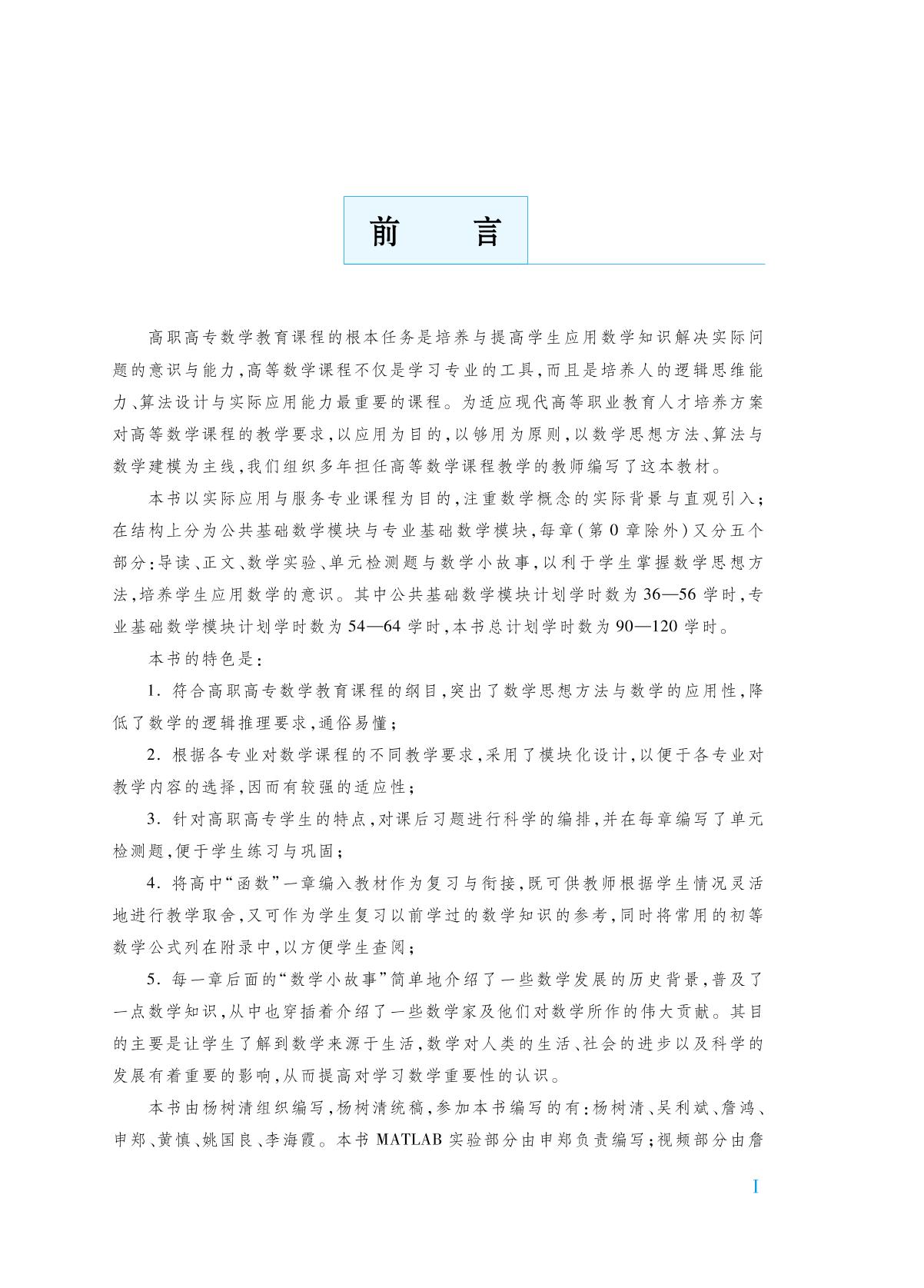 本书是根据编者多年高职高专的教学实践,并结合高职高专教育人才培养方案与高等数学课程的教学大纲编写而成的。 本书包括高职高专各专业必修的高等数学公共基础部分:函数、函数的极限与连续、导数的应用、不定积分、定积分;以及针对高职高专各专业的专业需求而设置的高等数学选修模块:常微分方程、多元函数微积分、无穷级数、拉普拉斯变换、线性代数与线性规划初步、概率论初步。全书共十二章。每章(第\u001E 章除外)又分五个部分:导读、正文、数学实验、单元检测题与数学小故事。本书中的部分知识点和例题配有讲解视频,读者可通过扫描书中的二维码及时获取。 本书以实际应用与服务专业课程为目的,注重数学概念的实际背景、直观引入与建模,逻辑清晰、叙述准确、通俗易懂。本书可作为高职高专院校各专业的数学教材,也可作为专升本辅导用书与教学参考书。 |
