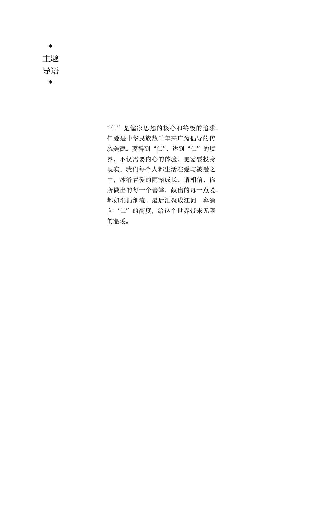 前辅文 第一讲 无用之用 无用之用 《庄子》 无用之用,是为大用 徐梓 郦波的“无用之用” 白雁 诗让心灵不死 潘裕民 第二讲 大学之道 《大学》(节选) 《大学》 推己及人的文化担当 王岳川 大学一解 梅贻琦 为什么读书 胡适 第三讲 仁者爱人 孔子论仁六则 《论语》 文帝议佐百姓诏 刘恒 怀大爱心,做小事情 何光沪 乞丐 [俄]屠格涅夫 山果 黄兴蓉 第四讲 家国情怀 秦风·无衣 《诗经》 乡土情结 柯灵 梦痕 丰子恺 第五讲 慎终追远 孔子论孝 《论语》 种瓜者:被误解的“慎终追远” 南怀瑾 奶奶的星星 史铁生 写给母亲 贾平凹 第六讲 事作于细 《道德经》两章 老子 差不多先生传 胡适 拜占庭的陷落 [奥]斯蒂芬·茨威格 留一只眼睛看自己 林清玄 第七讲 敬畏生命 敬畏生命 [法]阿尔贝特·史怀泽 我为什么而活着 [英]罗素 古难的价值 周国平 第八讲 和而不同 《道德经》第二章 老子 晏子对齐侯问 《左传》 容忍与自由 胡适 谈独立思考 茅盾 第九讲 守正创新 孙膑著书立说(节选) 栾传大 莫言:创新,让交流历久弥新 任姗姗 为传统文化的创新传播点赞 罗群 第十讲 相信未来 涉江 屈原 青春 [美]塞缪尔·厄尔曼 青年在选择职业时的考虚 [德]卡尔·马克思 相信未来 食指 第十一讲 诗意栖居 人,诗意地栖居 [德]荷尔德林 孤独 [美]梭罗 我的心灵告诚我 [黎巴嫩]纪伯伦 雅舍 梁实秋
